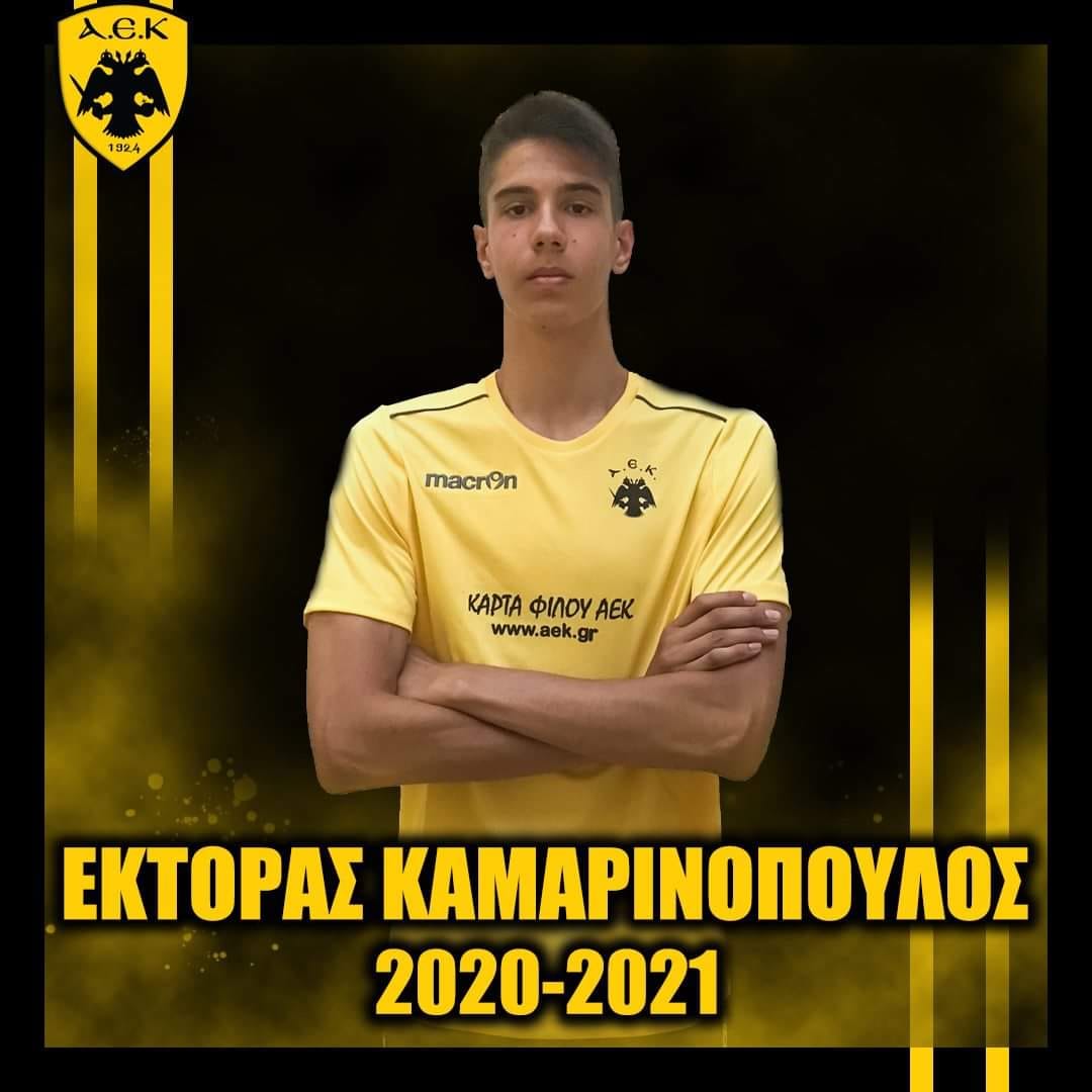 Ο Έκτορας Καμαρινόπουλος αγωνίζεται τους τελευταίους μήνες στην Ακαδημία της ΑΕΚ, έχοντας αφήσει εξαιρετικές εντυπώσεις στην ομάδα Παίδων, και πλέον θα ενισχύσει και την ανδρική ομάδα. Παράλληλα, την περασμένη αγωνιστική περίοδο κλήθηκε σε κλιμάκια της Εθνικής ομάδας για τα παιδιά με έτη γέννησης 2005-2007.