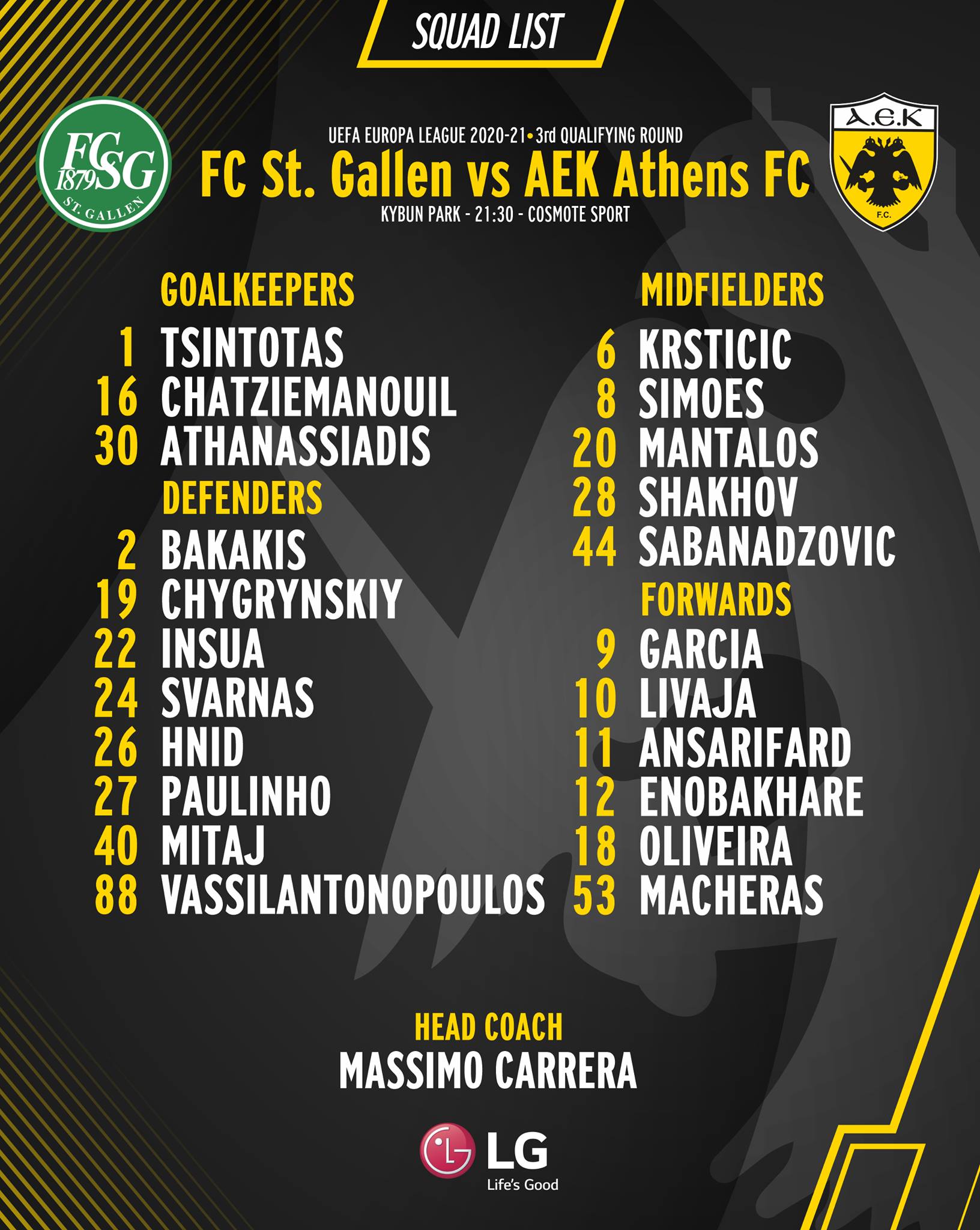 Έπειτα από το τέλος του προγράμματος ο Μάσιμο Καρέρα ανακοίνωσε την αποστολή για τον αγώνα της Πέμπτης με την Σεντ Γκάλεν, στο πλαίσιο του 3ου προκριματικού γύρου του UEFA Europa League.