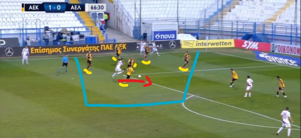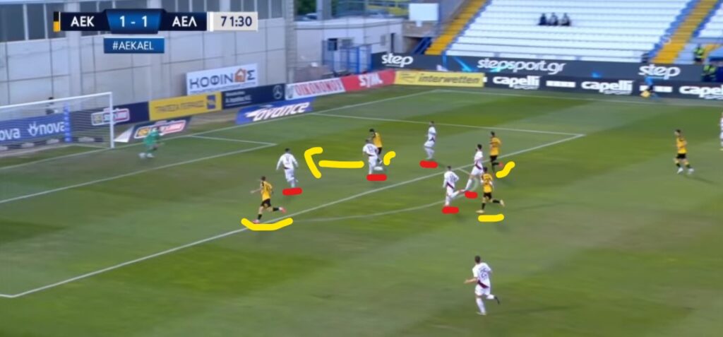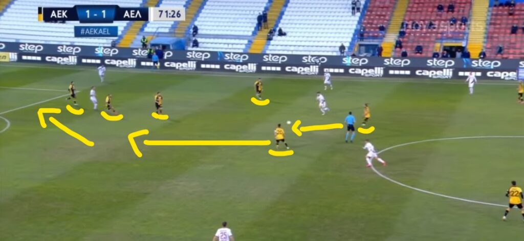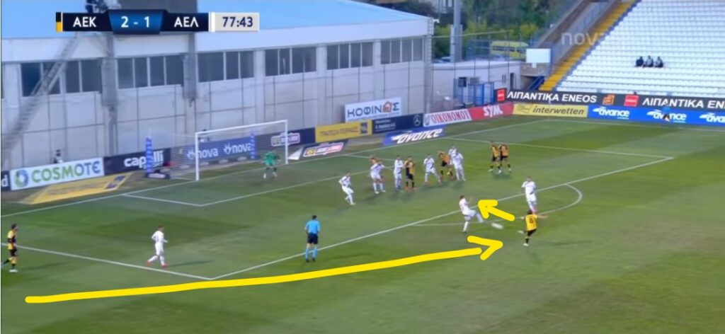 Στο 72’ η ΑΕΚ παίρνει και πάλι κεφάλι στο σκορ. Μετά από λάθος της άμυνας της ΑΕΛ και ενώ η Ενωση έχει γεμίσει το χώρο μεταξύ μεσαίας γραμμής και περιοχής της Λάρισας με έξι παίκτες, ο Σιμόες πασάρει γρήγορα στον Μάνταλο κι εκείνος με ασίστ δίνει στον Ανσαριφάρντ, ο οποίος δείχνει πως σκοράρουν οι επιθετικοί για το 2-1.