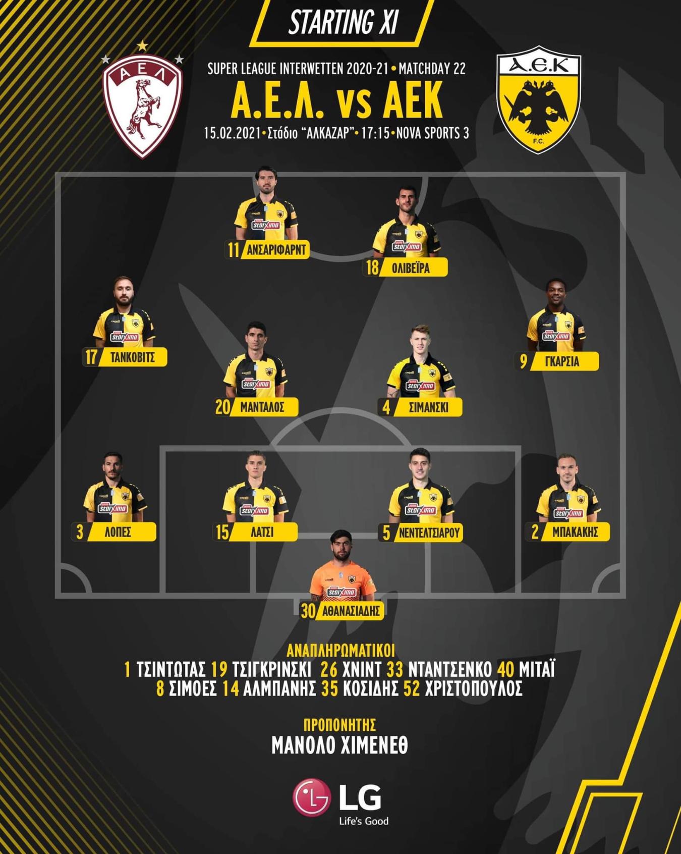 Ο Μανόλο Χιμένεθ μάλιστα ανακοίνωσε τον σχηματισμό των κιτρινόμαυρων που είναι το 1-4-4-2. Κάτω από τα δοκάρια θα είναι ο Αθανασιάδης με τον Ανδαλουσιανό τεχνικό να τον επαναφέρει εκ νέου στο αρχικό σχήμα. Μπακάκης και Λόπες στα άκρα της άμυνας, με τους Λάτσι και Νεντελτσιάρου στα στόπερ. Μάνταλος και Σιμάνσκι θα είναι στα χαφ, με τους Γκαρσία και Τάνκοβιτς στα άκρα, ενώ στη γραμμή κρούσης θα βρίσκονται οι Ανσαριφάρντ και Ολιβέιρα.