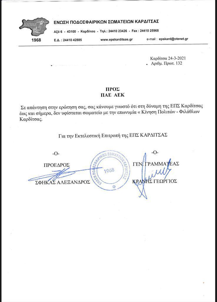 «Σας κάνουμε γνωστό ότι στη δύναμη της ΕΠΣ έως και σήμερα δεν υφίσταται σωματείο με την επωνυμία «Κίνηση Πολιτών-Φιλάθλων Καρδίτσας», απάντησε η ΕΠΣ Καρδίτσας στην ΑΕΚ σε σχετικό ερώτημα και η Ένωση επισημαίνει ότι πρόκειται για μια ανώνυμη καταγγελία.