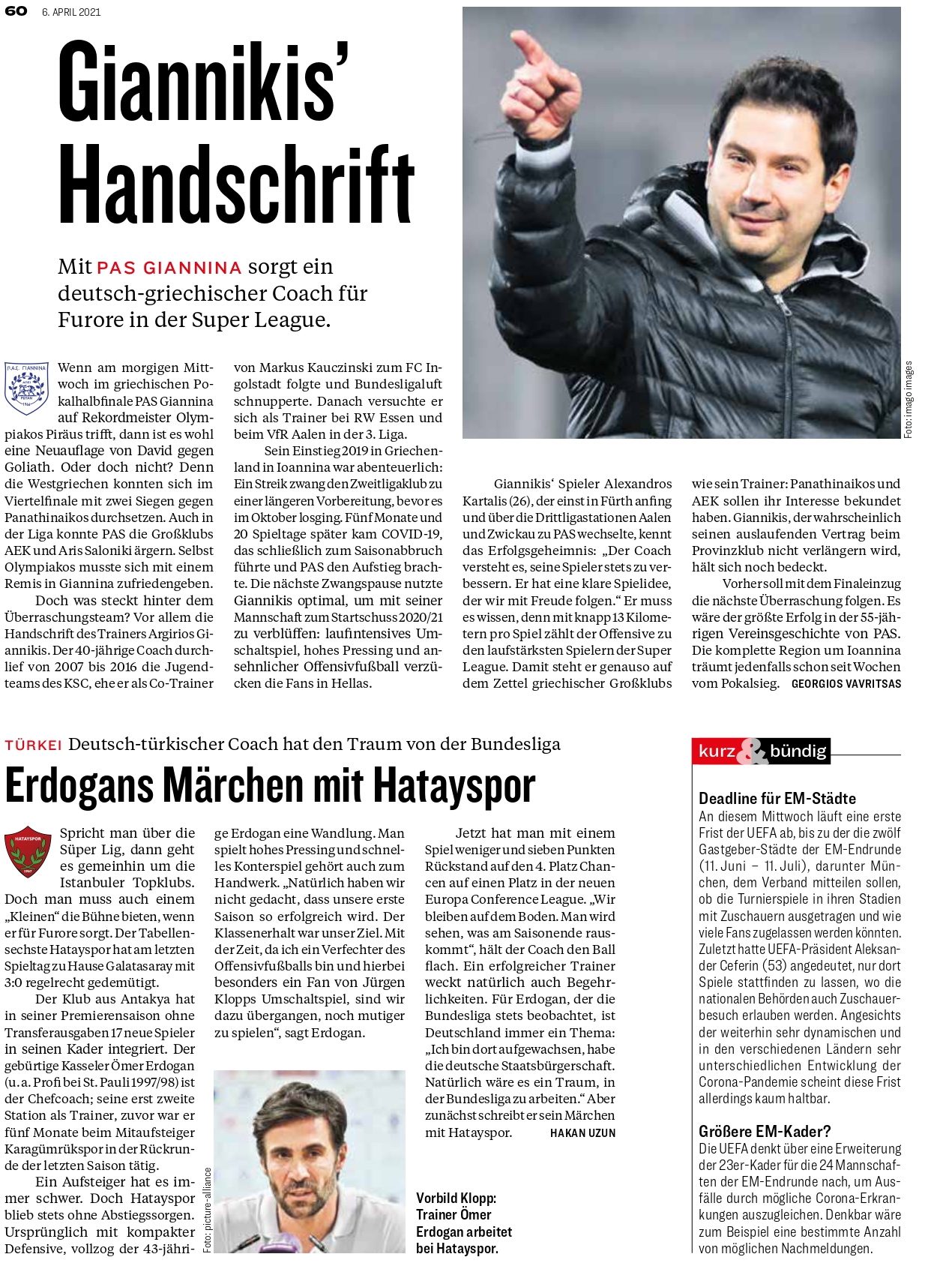 To «Kicker» φιλοξένησε πρόσφατα ολοσέλιδο αφιέρωμα, στο οποίο εξυμνεί τον νεαρό προπονητή του ΠΑΣ Γιάννινα, Αργύρη Γιαννίκη για το έργο του με αφορμή την αναμέτρηση του ΠΑΣ με τον Ολυμπιακό, τονίζοντας ότι επρόκειτο να γίνει μια «μάχη» ανάμεσα στον Δαβίδ και τον Γολιάθ.