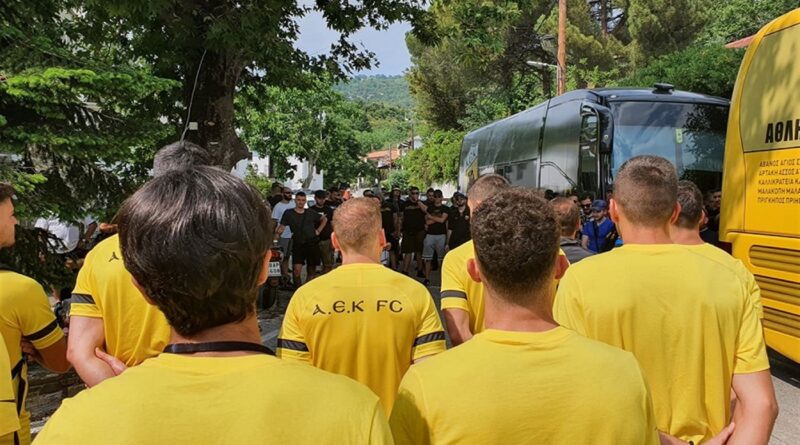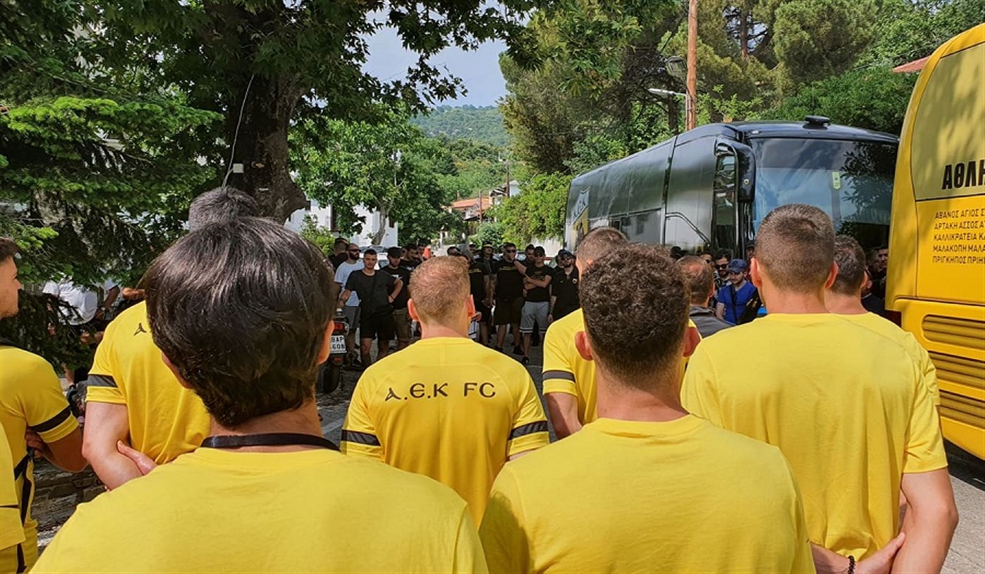 Οι οπαδοί της ΑΕΚ, κυρίως από τον Βόλο και τις γύρω περιοχές αποχώρησαν από το ξενοδοχείο με το σύνθημα “ΑΕΚ, γερά, πρωτάθλημα ξανά”.