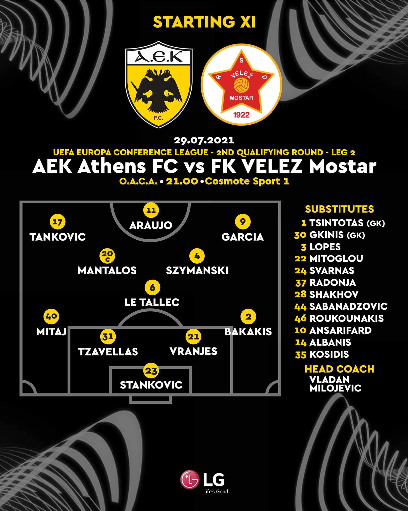 Τους… 11 της πρόκρισης επέλεξε ο Βλάνταν Μιλόγεβιτς για τη ρεβάνς με τη Βελέζ Μόσταρ. Ο προπονητής της ΑΕΚ επέλεξε σχηματισμό 4-1-4-1 που γίνεται και 4-3-3.