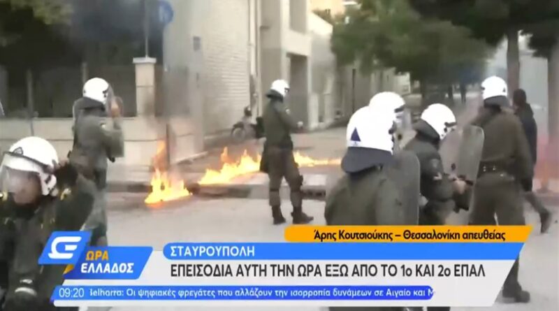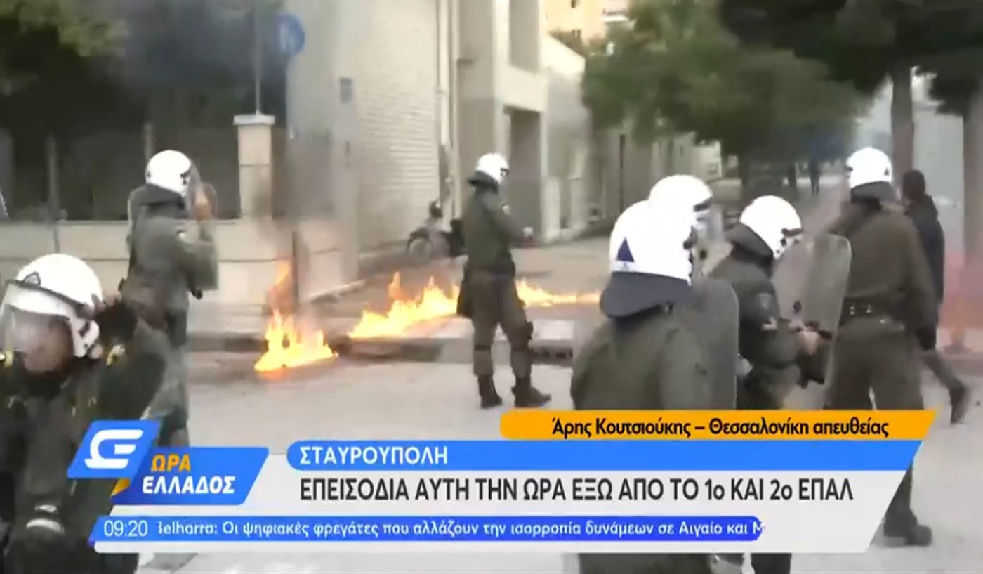 Σε πεδίο μάχης μετατράπηκε για δεύτερη ημέρα ο χώρος έξω από τα 1ο και 2ο ΕΠΑΛ Σταυρούπολης. Νέα “έφοδος” κουκουλοφόρων μέσα από το προαύλιο του σχολείου και επίθεση με βόμβες μολότοφ κροτίδες και άλλα αντικείμενα.