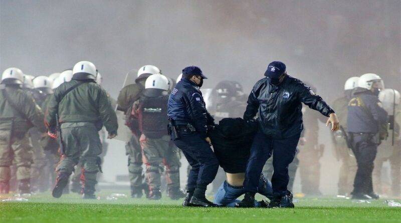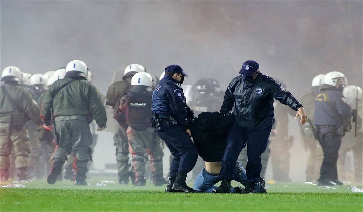 Τα επεισόδια ξεκίνησαν όταν οπαδοί του «Δικεφάλου» εισέβαλαν στον αγωνιστικό χώρο, πετώντας αντικείμενα, φωτοβολίδες και πυρσούς, ενώ επιτέθηκαν κατά αστυνομικών των ΜΑΤ, που έσπευσαν να τους αναχαιτίσουν.