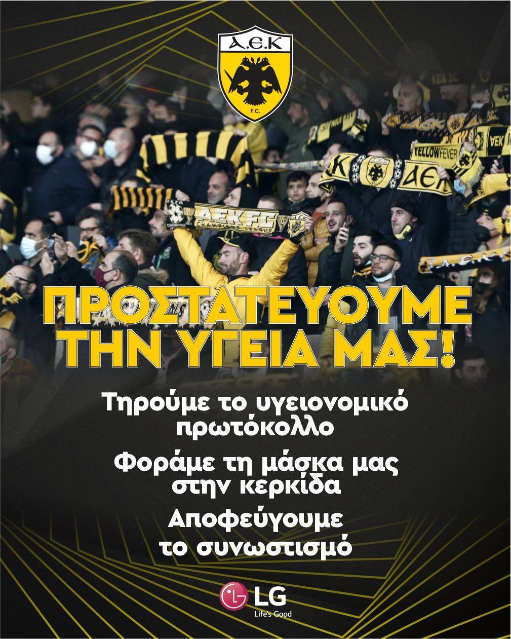 Νέο μήνυμα έστειλε η ΠΑΕ ΑΕΚ προς τον κόσμο της ενόψει του αυριανού ντέρμπι με τον Παναθηναϊκό, ζητώντας προσοχή (!!!) αλλά και τήρηση των υγειονομικών μέτρων.