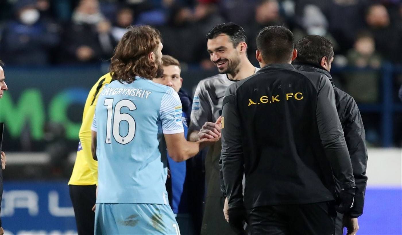 Χειραψίες και αγκαλιές με τους παίκτες της ΑΕΚ είχε ο Τσιγκρίνσκι