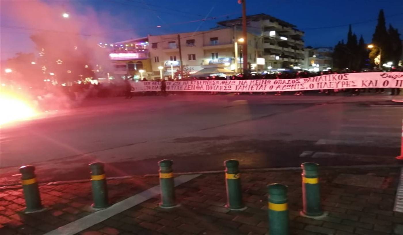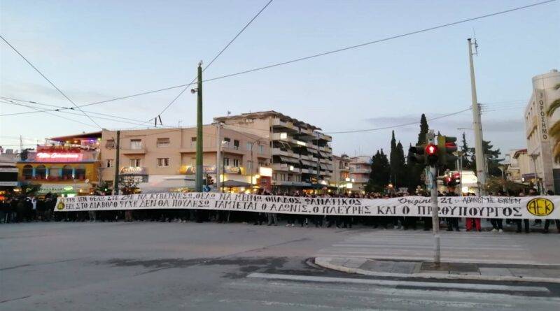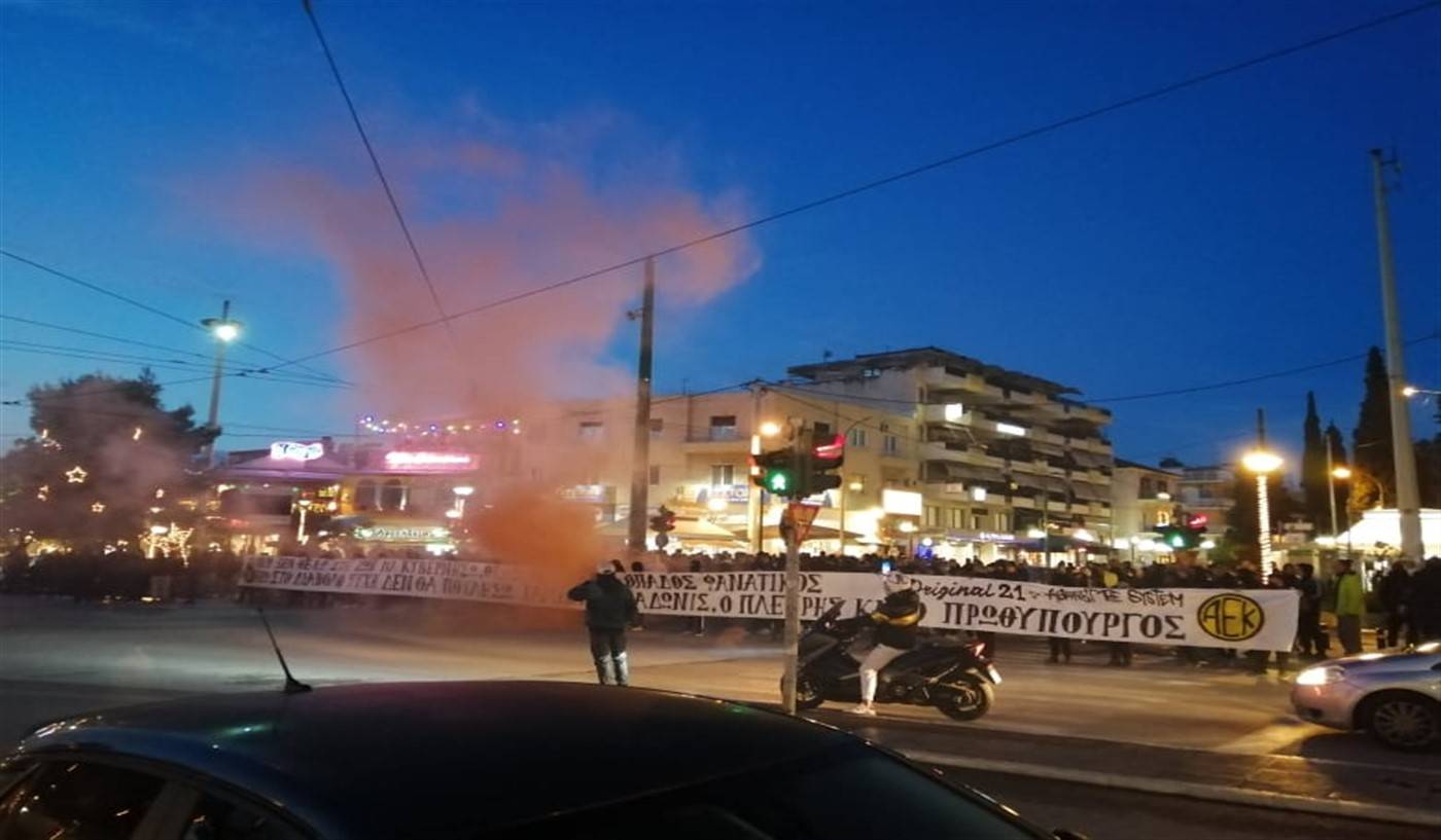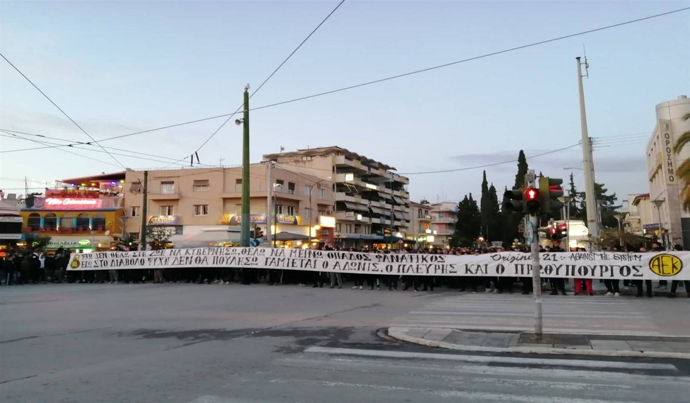 Λίγο μετά τις 17:00 σηκώθηκε ένα τεράστιο πανό από τους οπαδούς της ομάδας στην καρδιά της πόλης, ενώ έκλεισε η Λεωφόρο Δεκελείας. “Εγώ δεν θέλω στη ζωή να κυβερνήσω, θέλω να μείνω οπαδός φανατικός. Εγώ στο διάβολο ψυχή δεν θα πουλήσω, γ### ο Άδωνις, ο Πλεύρης και ο πρωθυπουργός”, έγραφε το πανό με υπογραφή Original 21 Against the system. AEK.