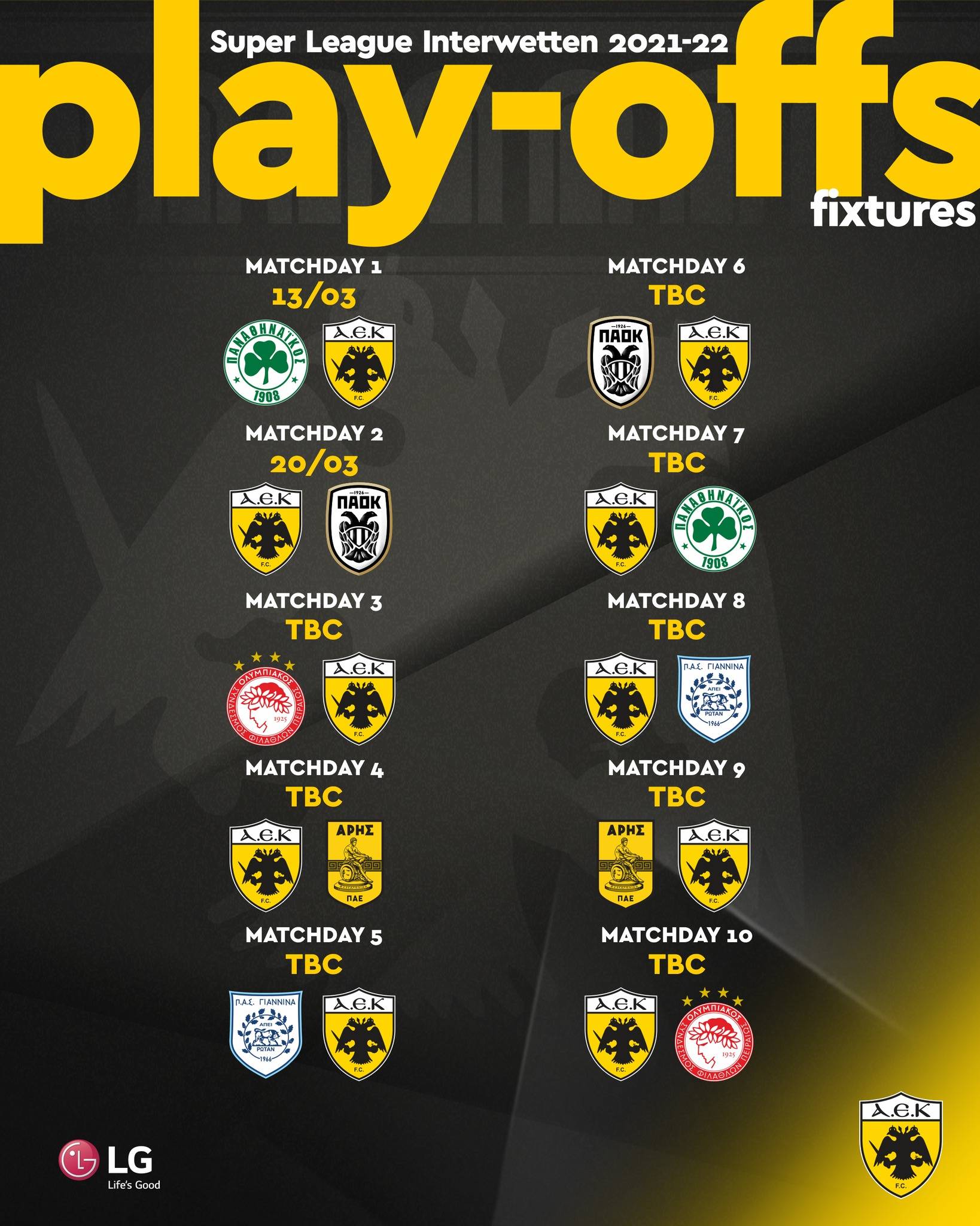 Με τον Παναθηναϊκό αρχίζει τη “μάχη” στο μίνι πρωτάθλημα των πλέι οφ η ΑΕΚ. Οι κιτρινόμαυροι φιλοξενούνται στη Λεωφόρο την Κυριακή για την 1η αγωνιστική. Την 2η αγωνιστική υποδέχονται τον ΠΑΟΚ και την 3η πηγαίνει στο Φάληρο για το ματς απέναντι στον Ολυμπιακό.