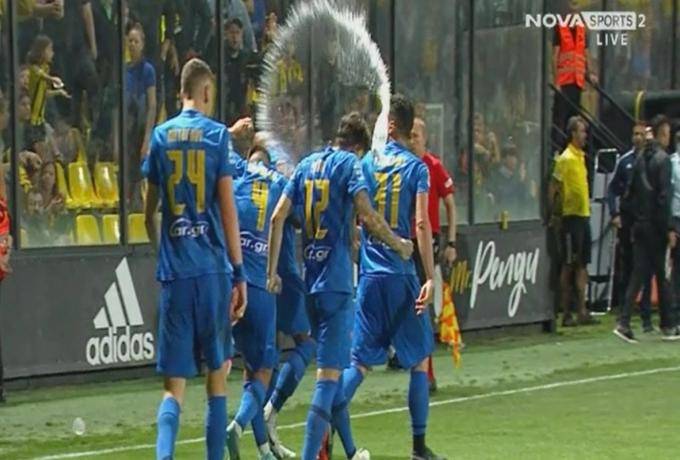 Συγκεκριμένα, το μπουκάλι έπεσε τη στιγμή που οι παίκτες της ΑΕΚ πανηγύριζαν το γκολ κοντά στα επίσημα του «Κλεάνθης Βικελίδης».