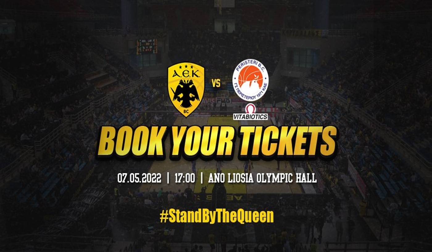 Η ΑΕΚ BC ανακοινώνει, ότι ξεκίνησε η ηλεκτρονική διάθεση των εισιτηρίων για την αναμέτρηση της 25ης αγωνιστικής της Basket League με αντίπαλο το Περιστέρι.