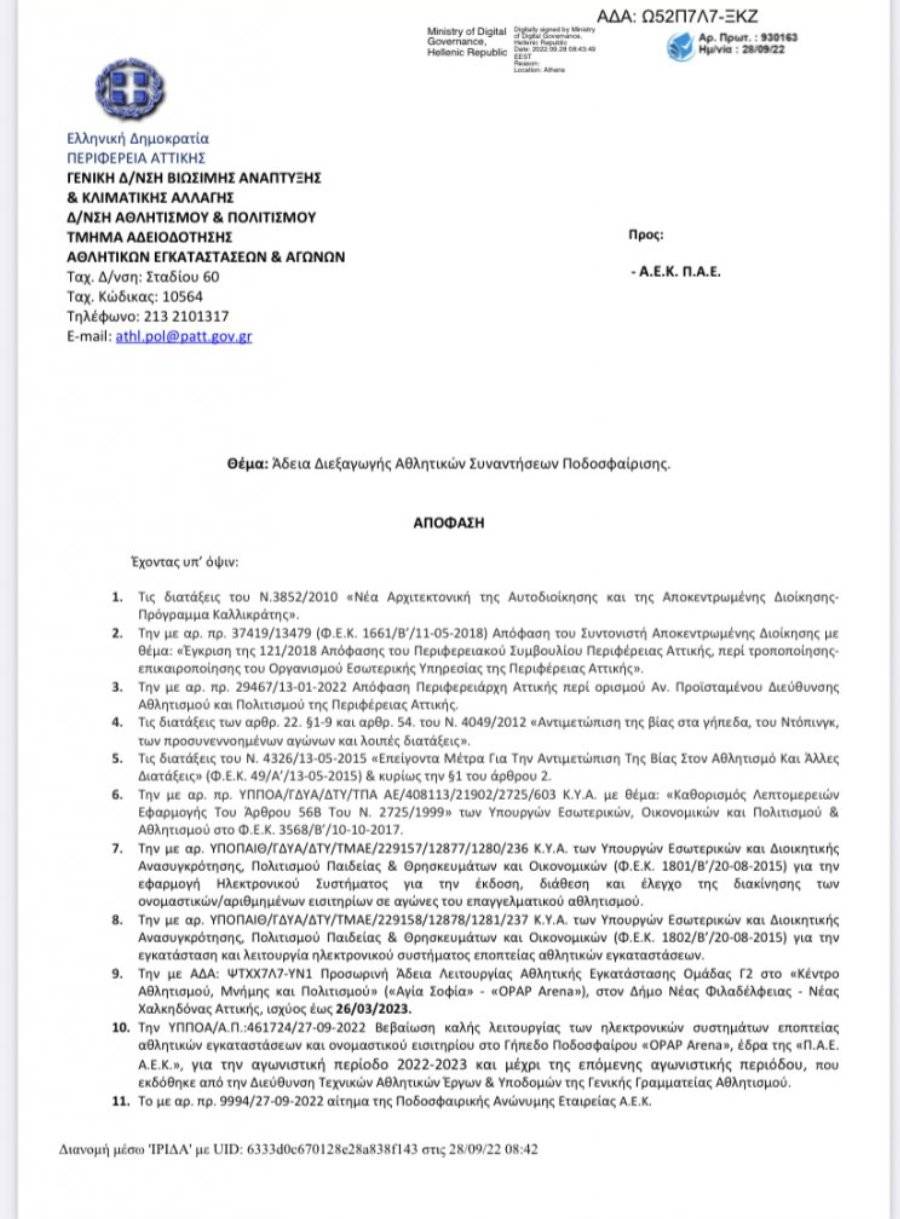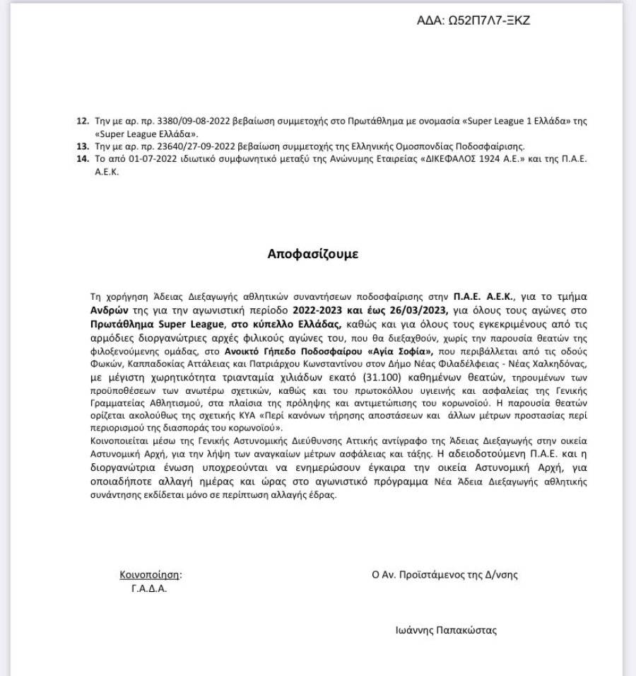 Αυτή είναι η επίσημη άδεια για τη χρήση του γηπέδου της ΑΕΚ (photos)