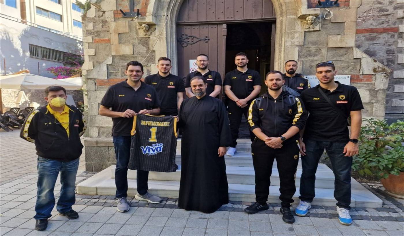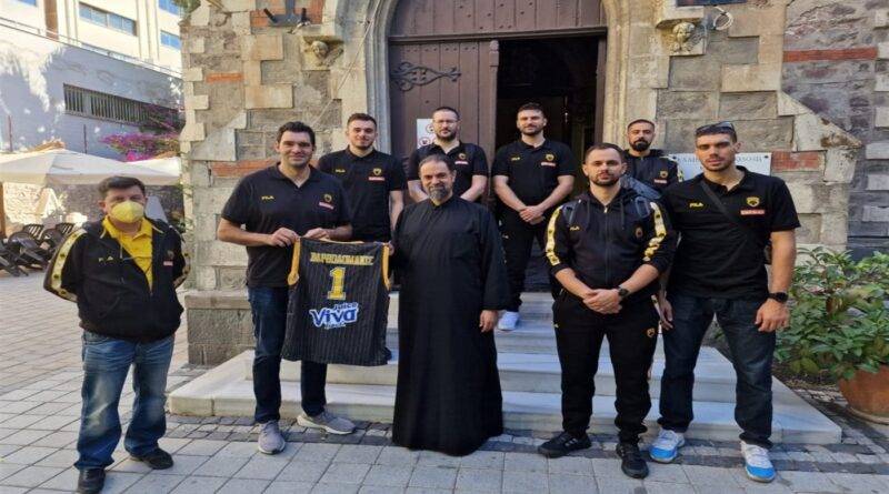 Οι «κιτρινόμαυροι» αθλητές/στελέχη λίγο πριν από την προπόνηση στο Κλειστό του χιλιοτραγουδισμένου Μπουρνόβα, προσκύνησαν με συγκίνηση και κατάνυξη στον Ιερό Ναό, και δέχτηκαν τον Θείο Λόγο και τη φιλοξενία του Πανασιολογιωτάτου Αρχιμανδρίτου, κ. Πολύκαρπου Θεοφάνη, Ιερατικώς Προϊσταμένου της Ορθοδόξου Κοινότητος Σμύρνης.