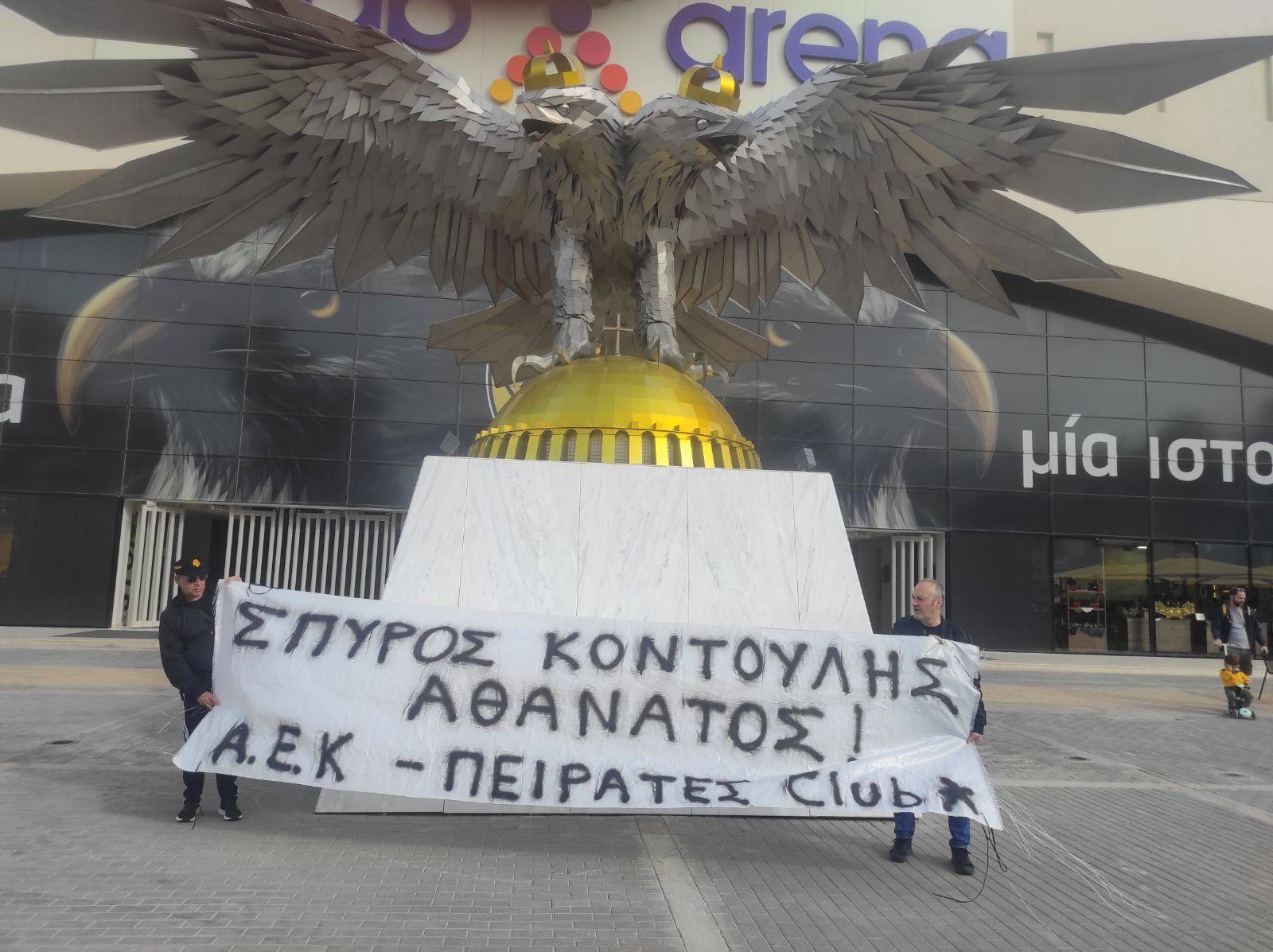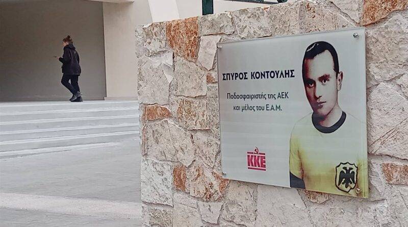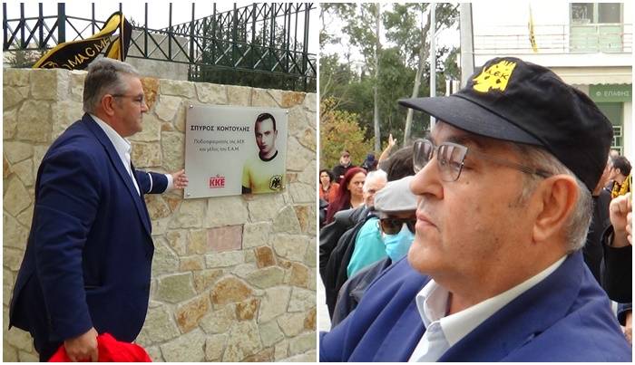 Η αποκάλυψη της τιμητικής πλακέτας έγινε από τον γενικό γραμματέα της ΚΕ του ΚΚΕ, Δημήτρη Κουτσούμπα, ενώ στην εκδήλωση ήταν παρόντες φίλοι της ΑΕΚ φορώντας τις φανέλες της Ένωσης και φωνάζοντας συνθήματα. Ο κ. Κουτσούμπας μάλιστα φόρεσε καπέλο των Πειρατών του Ονείρου, ενώ αρκετοί ήταν και οι οπαδοί του Δικεφάλου από συνδέσμους της Original αλλά και από το φαν κλαμπ του “Σπύρου Κοντούλη”.
