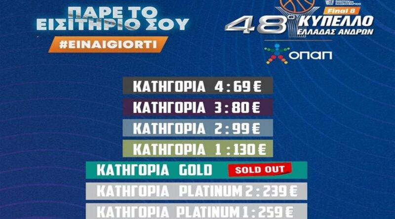 Η ΕΟΚ ανακοίνωσε πως εξαντλήθηκαν ήδη τα εισιτήρια της κατηγορίας Gold για το Final 8 του Κυπέλλου, που θα φιλοξενηθεί 16-19 Φεβρουαρίου στο Ηράκλειο και στα «Δύο Αοράκια».