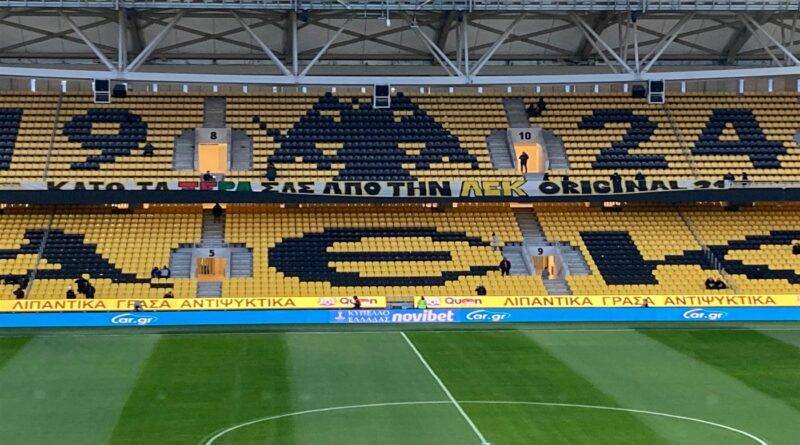 Σε πανό που έχει αναρτηθεί, ήδη, στο γήπεδο, η μεγαλύτερη οργάνωση οπαδών της ΑΕΚ αναφέρει: «Κάτω τα ξερά σας από την ΑΕΚ, Original 21».