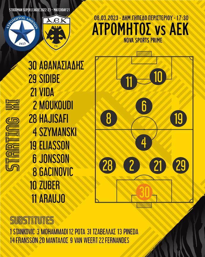 Συγκεκριμένα, κάτω από τα δοκάρια θα είναι ο Αθανασιάδης. Την αμυντική τετράδα θα συνθέτουν, από δεξιά προς τα αριστερά, οι Σιντιμπέ, Βίντα, Μουκουντί και Χατζισαφί. Δίδυμο στα κεντρικά χαφ οι Σιμάνσκι και Γιόνσον, στη δεξιά πλευρά της μεσαίας γραμμής θα είναι ο Ελίασον, στα αριστερά ο Γκατσίνοβιτς, με τον Αραούχο να κινείται πίοω από τον Τσούμπερ.