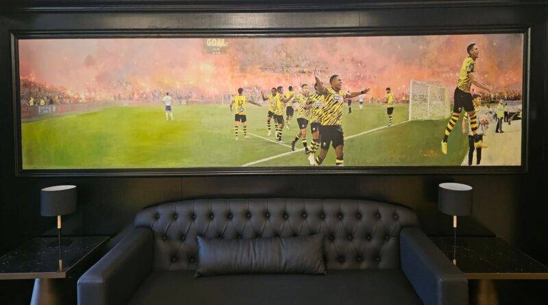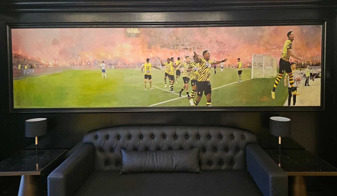 Ο εν λόγω πίνακας αφορά στο ματς με τον Ιωνικό και απεικονίζει τον πανηγυρισμό του πρώτου γκολ που σημειώθηκε στο σπίτι μας, από τον Μιγιάτ Γκατσίνοβιτς.