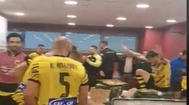 Τρελό πάρτι έστησαν οι ποδοσφαιριστές της ΑΕΚ στα αποδυτήρια του “Γεώργιος Καραϊσκάκης” μετά την εμφατική νίκη με 3-1.