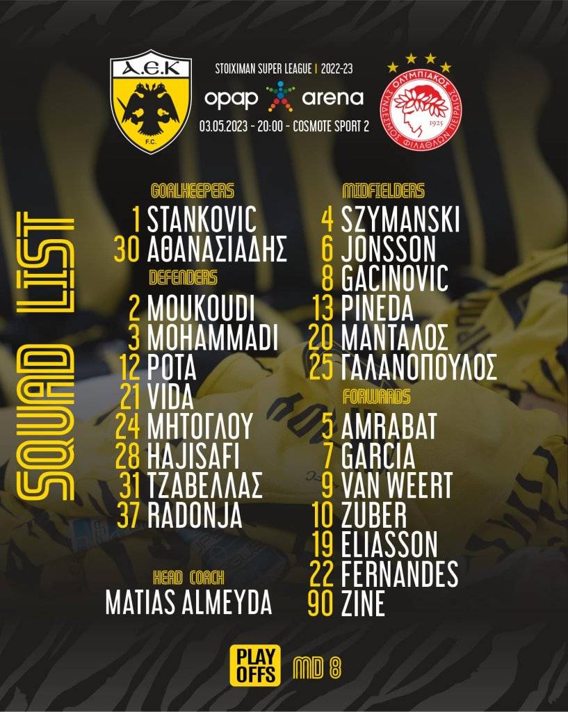 Αναλυτικά την αποστολή της ΑΕΚ απαρτίζουν οι: Στάνκοβιτς, Αθανασιάδης, Μουκουντί, Μοχαμάντι, Ρότα, Βίντα, Μήτογλου, Χατζισαφί, Τζαβέλλας, Ραντόνια, Σιμάνσκι, Γιόνσον, Πινέδα, Γκατσίνοβιτς, Μάνταλος, Γαλανόπουλος, Άμραμπατ, Λιβάι Γκαρσία, Φαν Βέερτ, Τσούμπερ, Ελίασον, Πάολο Φερνάντες και Ζίνι.