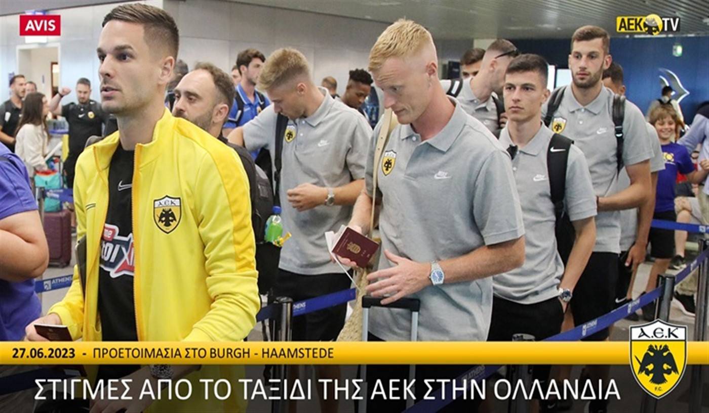 Οι Κιτρινόμαυροι αναχώρησαν το μεσημέρι από το «Ελ. Βενιζέλος» με προορισμό το αεροδρόμιο των Βρυξελλών, απ’ όπου ταξίδεψαν οδικώς για την Ολλανδία. Η κάμερα του AEK TV ακολούθησε την αποστολή και κατέγραψε στιγμές από το ταξίδι της ομάδας.