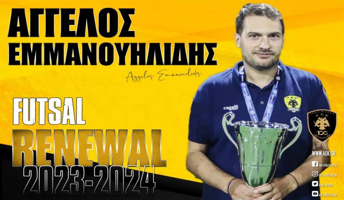 Η ΑΕΚ βρίσκεται στην ευχάριστη θέση να ανακοινώσει την ανανέωση της συνεργασίας της με τον Άγγελο Εμμανουηλίδη, ο οποίος θα παραμείνει στον πάγκο της ανδρικής ομάδας Futsal και τη νέα σεζόν.