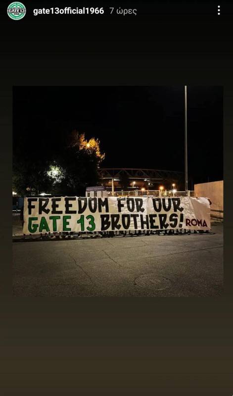 Πιο συγκεκριμένα, ανέβηκε στα Instagram stories της σελίδα της Θύρας 13, ένα πανό της Ρόμα, στο οποίο ζητούν να απελευθερωθούν οι χούλιγκαν που συνελήφθησαν για τη δολοφονία του 29χρονου Μιχάλη έξω από το γήπεδο της ΑΕΚ αργά το βράδυ της Δευτέρας (7/8).
