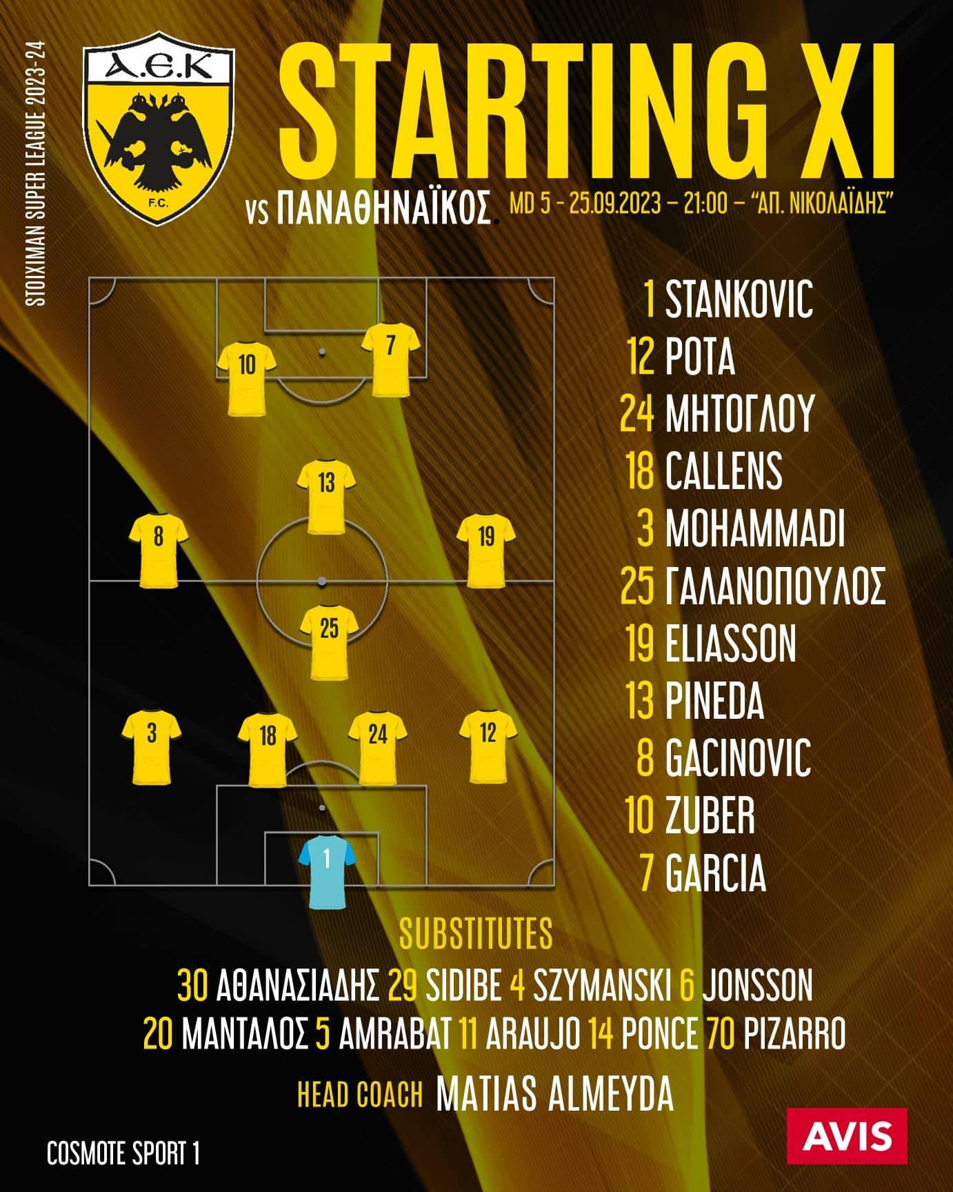 Ο Ματίας Αλμέιδα γνωστοποίησε τους 11 με τους οποίους θα ξεκινήσει στο ντέρμπι απέναντι στον Παναθηναϊκό, με τον Αλεξάντερ Κάλενς να κάνει το ντεμπούτο του στη Λεωφόρο και τον Γαλανόπουλο να παίρνει φανέλα βασικού.