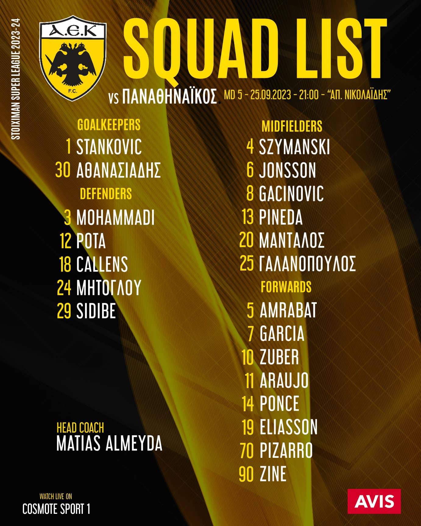 Εκτός τέθηκε τελικά ο Χατζισαφί που υπέστη διάσειση στον θρίαμβο του Μπράιτον, ενώ εκτός παραμένει ο Βίντα που είχε χτυπήσει στα πλευρά στο ντέρμπι με τον Ολυμπιακό, αλλά και ο Μουκουντί που ακόμα ταλαιπωρείται από τη λοίμωξή του.