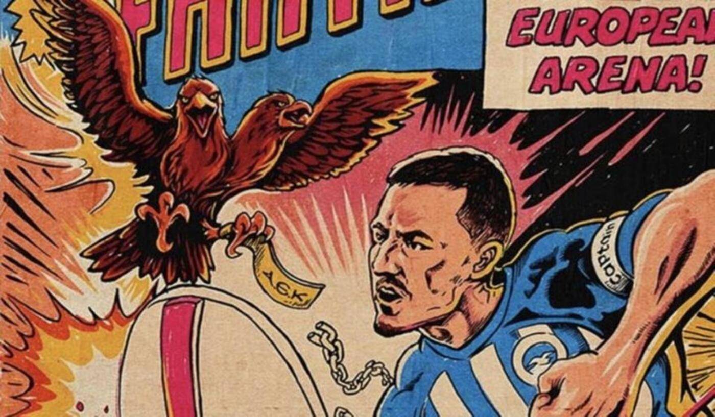 Οι “γλάροι” εμφάνισαν έναν παίκτη τους να μάχεται με ασπίδα, έχοντας ως φόντο την Ακρόπολη και καταδιωκόμενος από έναν δικέφαλο αετό.