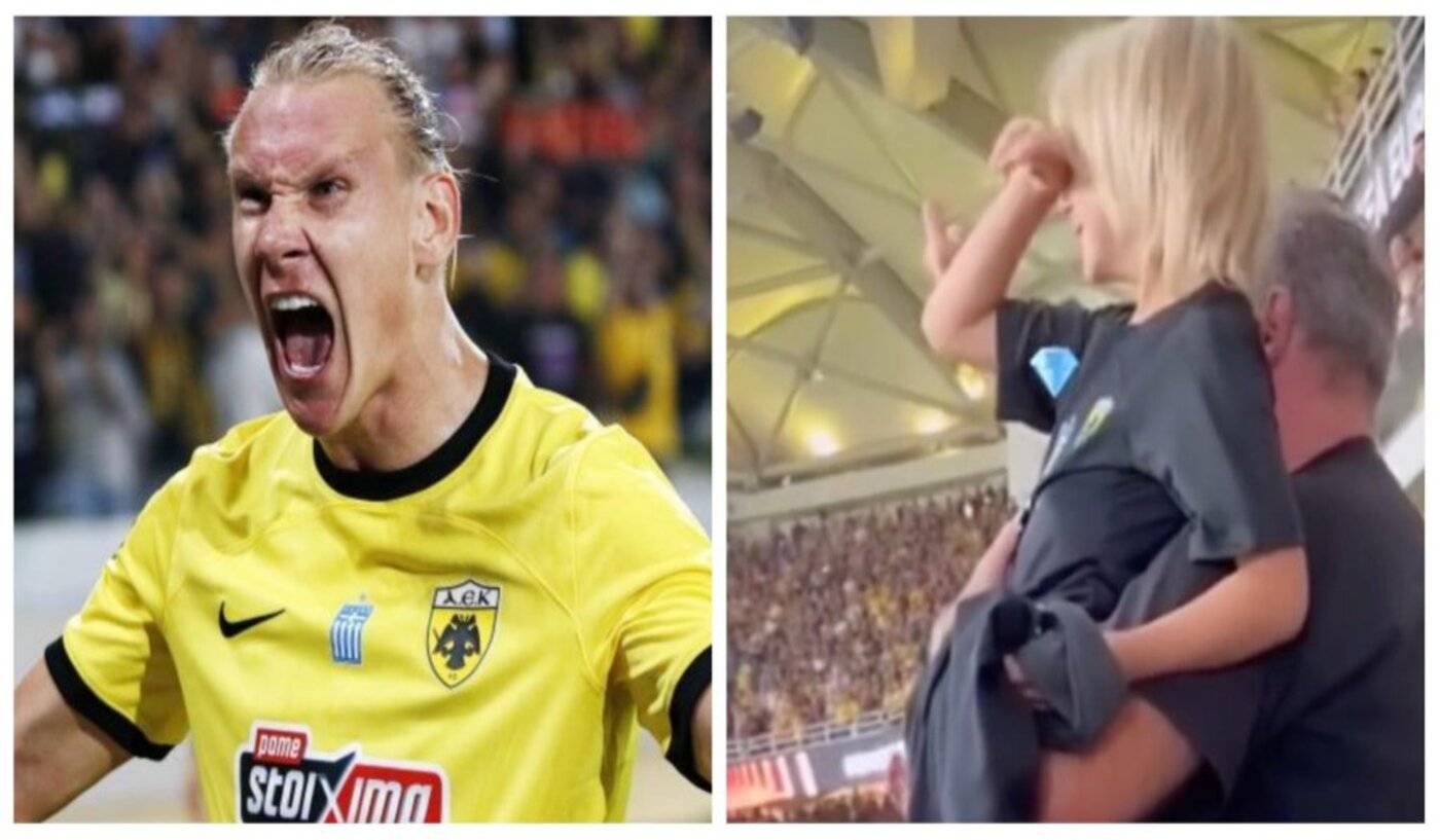 Δεν άντεξε τη στιγμή του γκολ από τον πατέρα του ο γιος του Ντομαγκόι Βίντα απέναντι στον Άγιαξ. Ο Κροάτης στόπερ της ΑΕΚ σκοράρει, κάνει το 1-1 και ο γιος του ξεσπά…