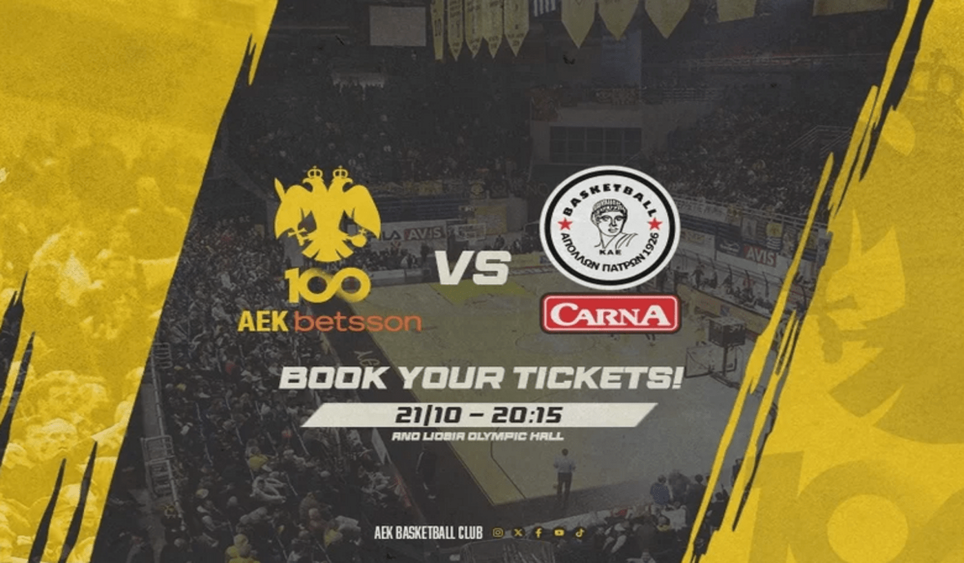 Η ΑΕΚ ΒETSSON BC ενημερώνει, ότι ξεκίνησε η διάθεση των εισιτηρίων για την αναμέτρηση της «Βασίλισσας» με αντίπαλο τον Απόλλωνα Πάτρας, στο πλαίσιο της 3ης αγωνιστικής της Basket League 2023-2024, η οποία θα διεξαχθεί το Σάββατο (21/10, 20:15), στο Olympic Hall των Άνω Λιοσίων.