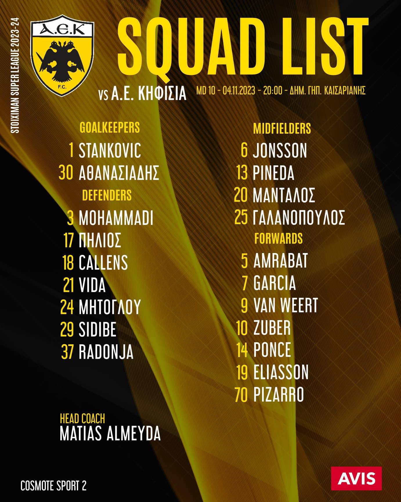 Αναλυτικά η αποστολή: Στάνκοβιτς, Αθανασιάδης, Μοχαμάντι, Πήλιος, Καλένς, Βίντα, Μήτογλου, Σιντιμπέ, Ραντόνια, Γιόνσον, Πινέδα, Μάνταλος, Γαλανόπουλος, Άμραμπατ, Γκαρσία, Φαν Βέερτ, Τσούμπερ, Πόνσε, Ελίασον και Πισάρο.