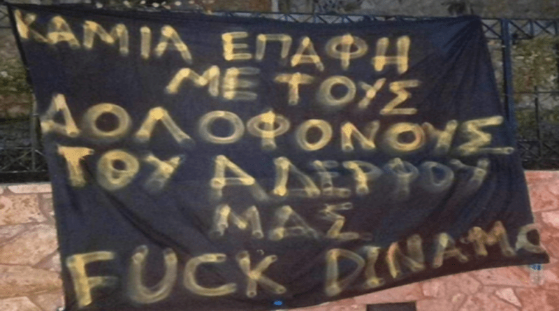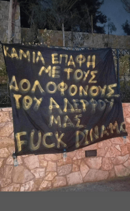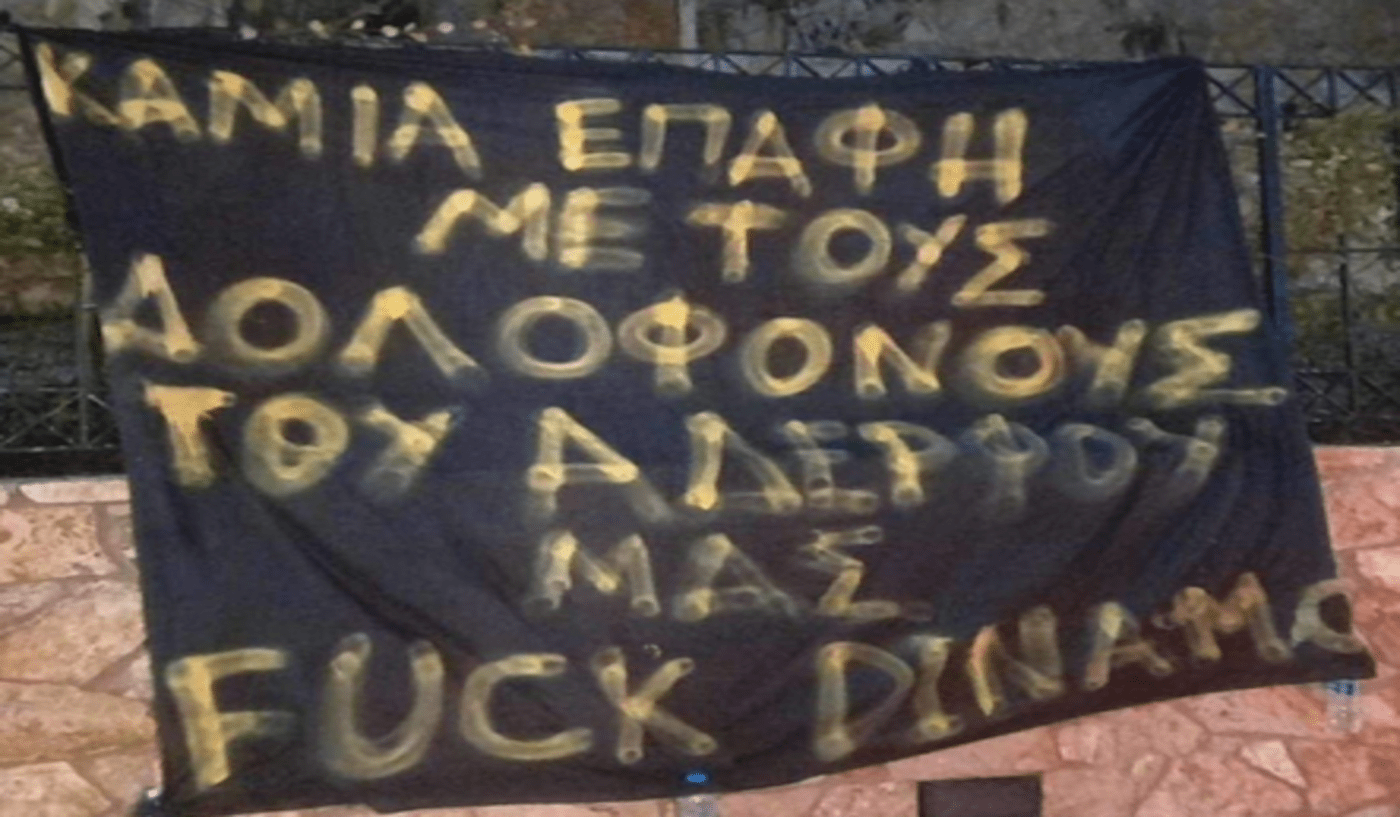 Με πανό που ανάρτησαν έξω από το γήπεδο στη Νέα Φιλαδέλφεια οργανωμένοι οπαδοί της ΑΕΚ στέλνουν μήνυμα στη διοίκηση λέγοντας: “Καμία επαφή με τους δολοφόνους του αδερφού μας” θυμίζοντας σε όλους τι είχε συμβεί τον περασμένο Αύγουστο με τη δολοφονία του Μιχάλη Κατσουρή.