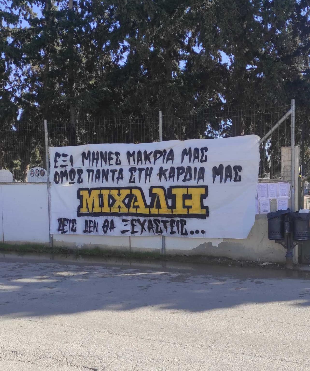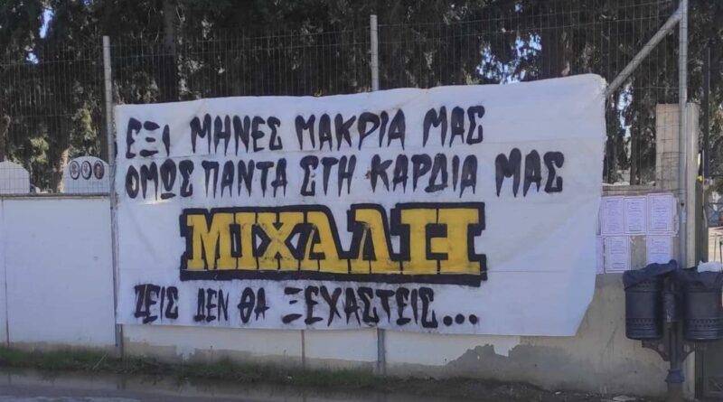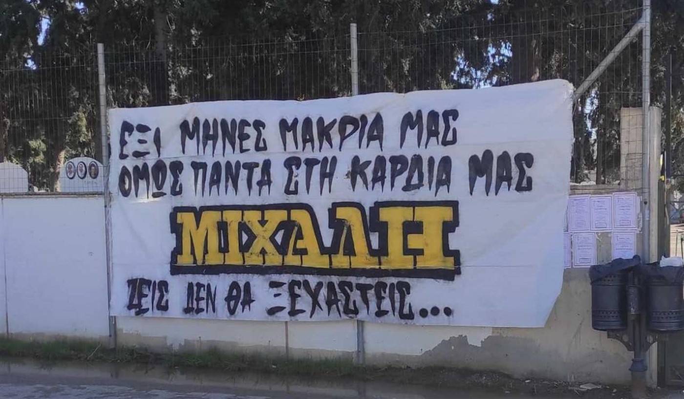 Εκεί οι φίλοι της ΑΕΚ ανάρτησαν ένα πανό γι’ αυτούς που θέλουν ή προσπαθούν να μας κάνουν να ξεχάσουμε (δεν θα τους περάσει) για τον Μιχάλη το οποίο έγραφε: “Έξι μήνες μακριά μας όμως πάντα στην καρδιά μας. Μιχάλη ζεις δεν θα ξεχαστείς”