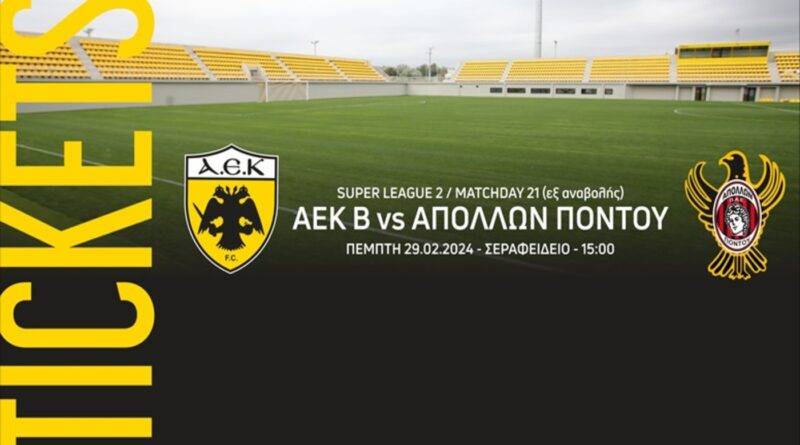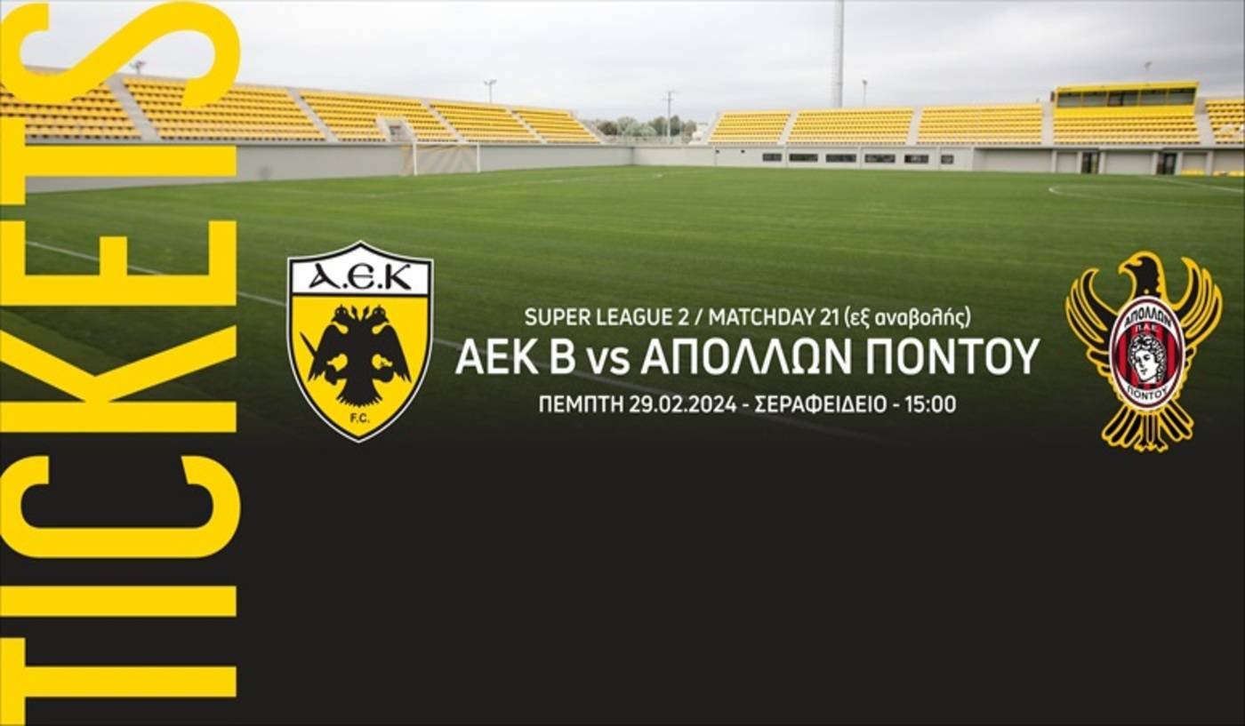 Η ΠΑΕ ΑΕΚ ενημερώνει ότι έχει τεθεί σε λειτουργία το ηλεκτρονικό εισιτήριο για τον εξ αναβολής αγώνα ΑΕΚ B – ΑΠΟΛΛΩΝ ΠΟΝΤΟΥ για την 21η αγωνιστική του πρωταθλήματος Super League 2, την Πέμπτη 29/02 στις 15:00 Σεραφείδειο.