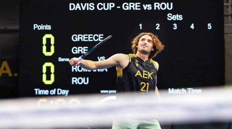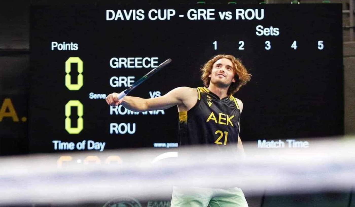 Στέφανος Τσιτσιπάς και Μιντάουγκας Κουζμίνσκας έπαιξαν τένις στο κλειστό γήπεδο μπάσκετ της ΑΕΚ στα Λιόσια τα οποία έχει μεταμορφωθεί σε κλειστό γήπεδο τένις.