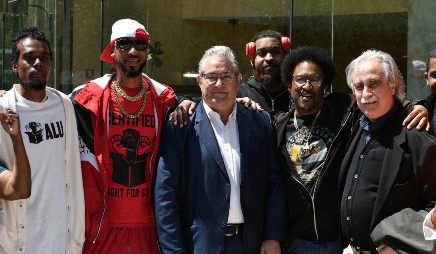 Μέλη της διοίκησης του Σωματείου και ο πρόεδρος του Συνδικάτου των εργαζομένων στην Amazon, Chris Smalls, τον υποδέχτηκαν με χειροκροτήματα και συνθήματα το μεσημέρι της Παρασκευής 26 Απριλίου 2024, στα γραφεία του Σωματείου στο Staten Island.