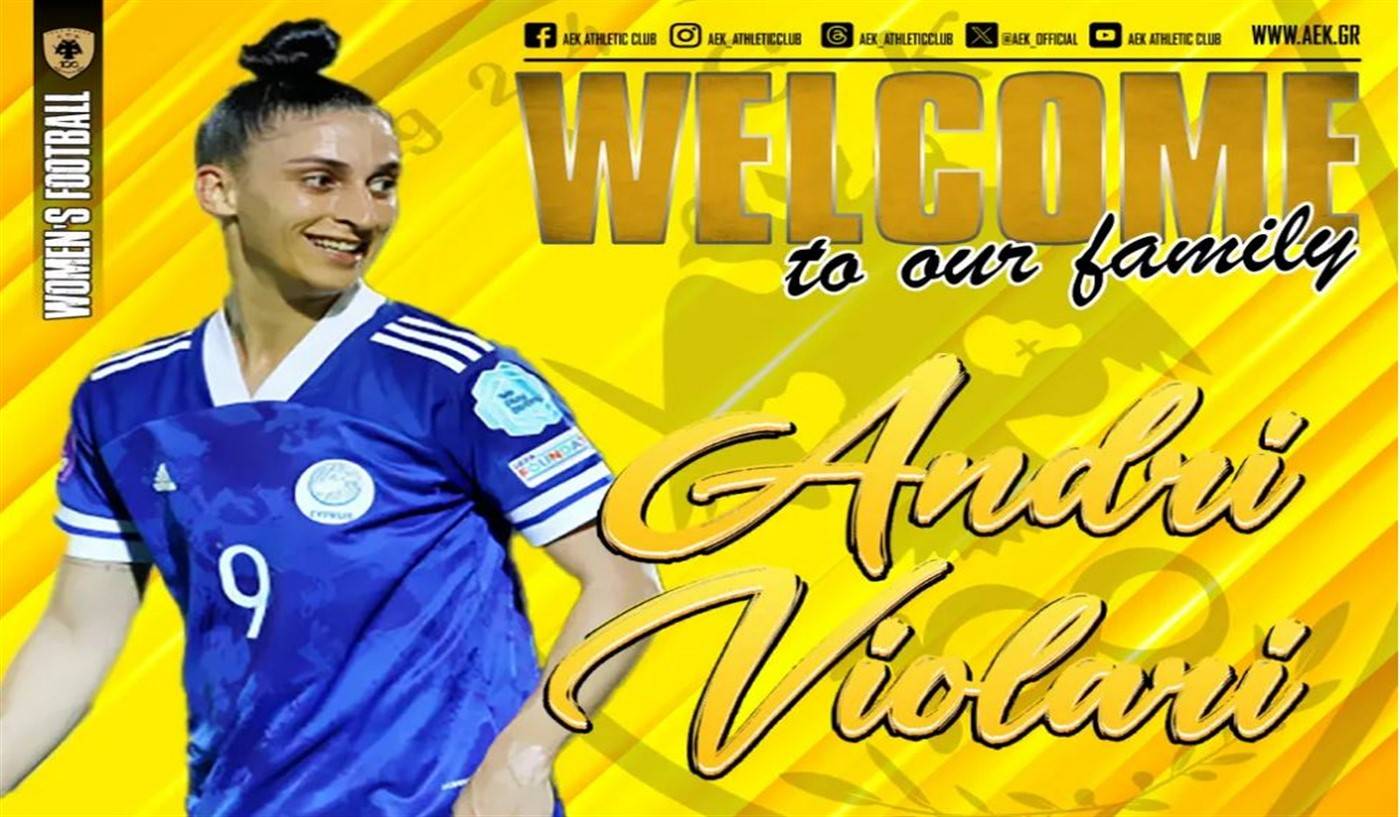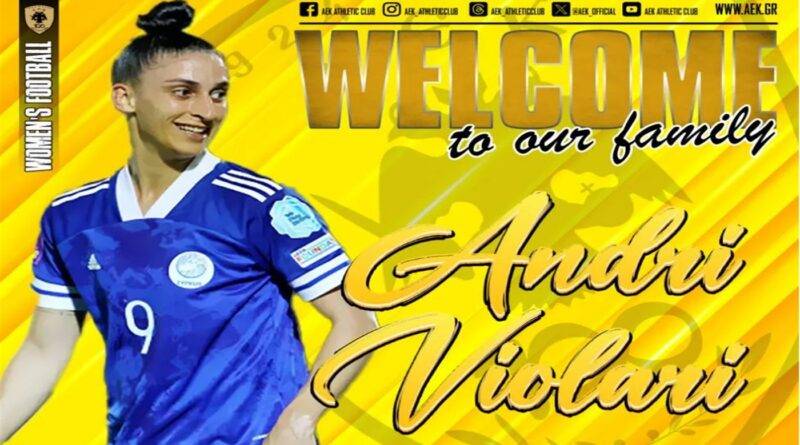 Η ΑΕΚ βρίσκεται στην πολύ ευχάριστη θέση να ανακοινώσει την έναρξη της συνεργασίας της με την Άντρι Βιολάρη. Η 28χρονη (27/09/1996) διεθνής Κύπρια επιθετικός, ύψους 1,75 μ., υπέγραψε το συμβόλαιό της και εντάσσεται στο δυναμικό της ομάδας Ποδοσφαίρου Γυναικών της ΑΕΚ.