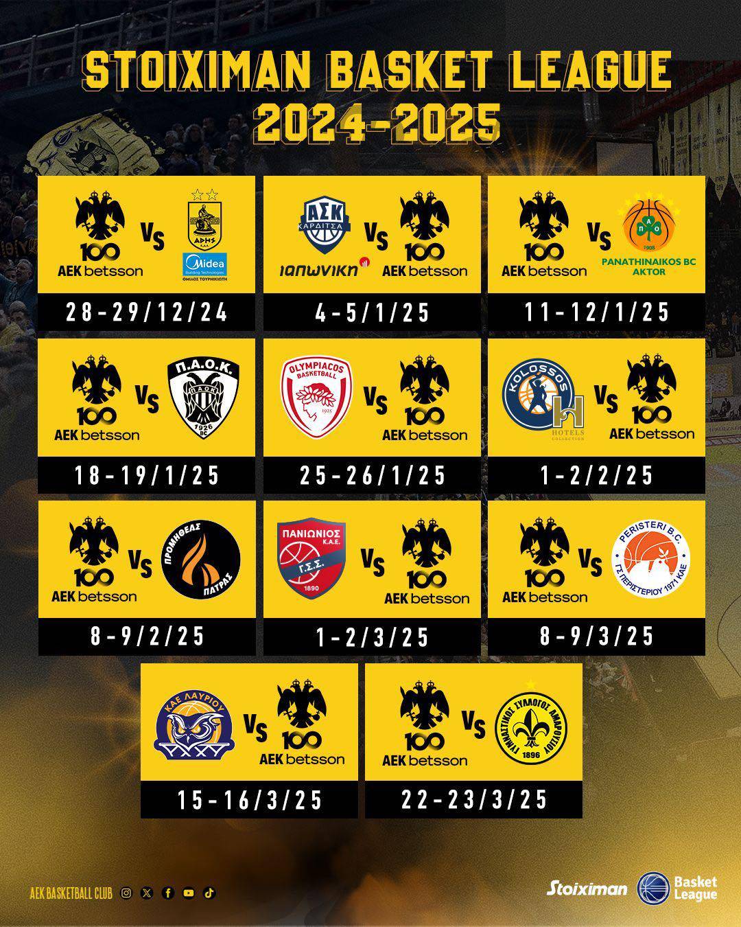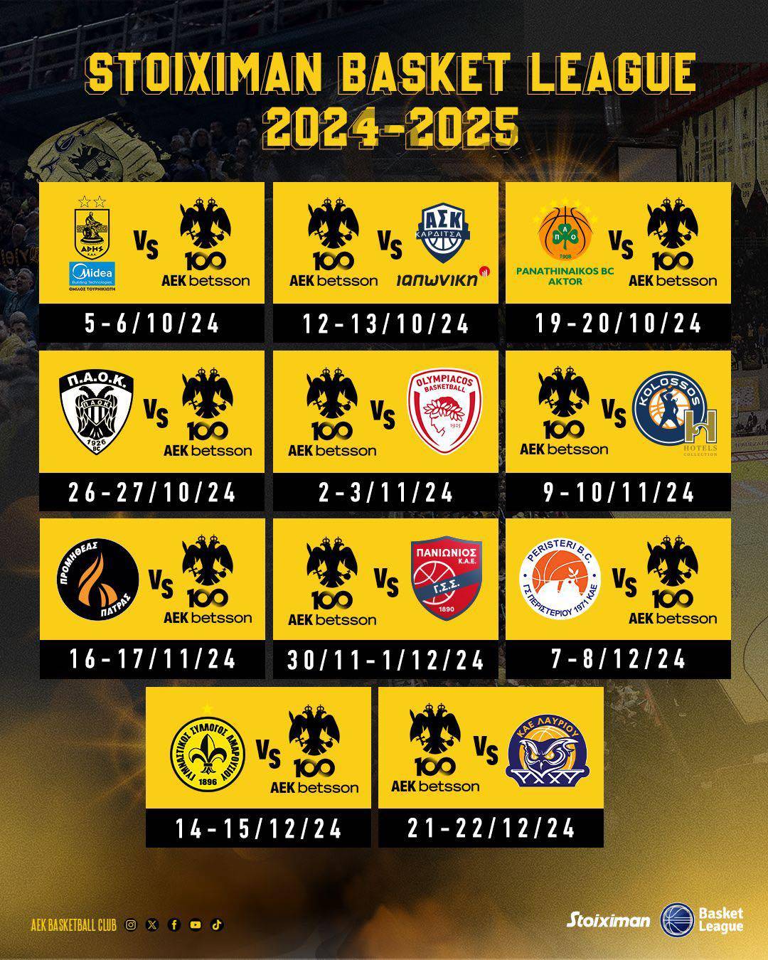 Η ΑΕΚ έμαθε το πρόγραμμα του φετινού πρωταθλήματος της Basket League 2024-25 και κάνει πρεμιέρα στο Αλεξάνδρειο με αντίπαλο τον Άρη.
