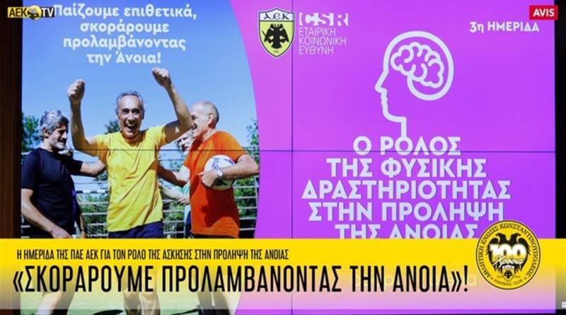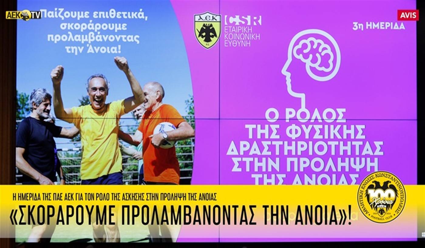 Στο πλαίσιο του προγράμματος Εταιρικής Κοινωνικής Ευθύνης, η ΠΑΕ ΑΕΚ προχώρησε σε ακόμη μια σημαντική δράση, διοργανώνοντας -με αφορμή την Παγκόσμια Ημέρα για την Τρίτη Ηλικία- ημερίδα σχετικά με τον ρόλο της φυσικής δραστηριότητας στην πρόληψη της Άνοιας.
