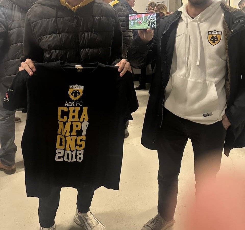 Δύο φίλοι της Ένωσης, ο ένας κρατά μία μπλούζα από το πανάξιο πρωτάθλημα της ΑΕΚ το 2018 και ο άλλος να δείχνει με το κινητό του τη φάση του γκολ οφσάιντ του Μαουρίσιο, όπως βλέπετε και στην φωτογραφία ήταν αυτά που έκαναν τους ανθρώπους του ΠΑΟΚ να βγουν έξω από το πούλμαν και να πουλήσουν… ψευτομαγκιά και να βρίζουν χυδαία!