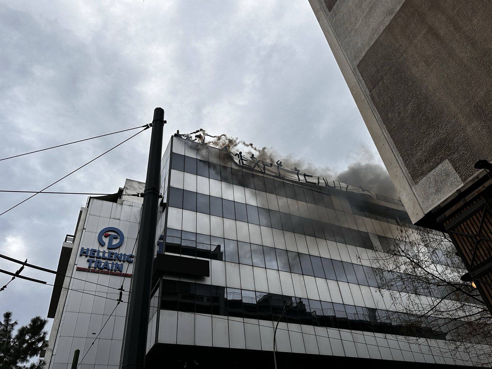 Mέλη του Ρουβίκωνα ανέβηκαν χωρίς να τους αντιληφθεί κανείς στην ταράτσα του κτιρίου της Hellenic Train, στη λεωφόρο Συγγρού και ανήρτησαν πανό για τα Τέμπη που γράφει «μέχρι τέλους», και «δολοφόνοι» ενώ άναψαν και καπνογόνα.
