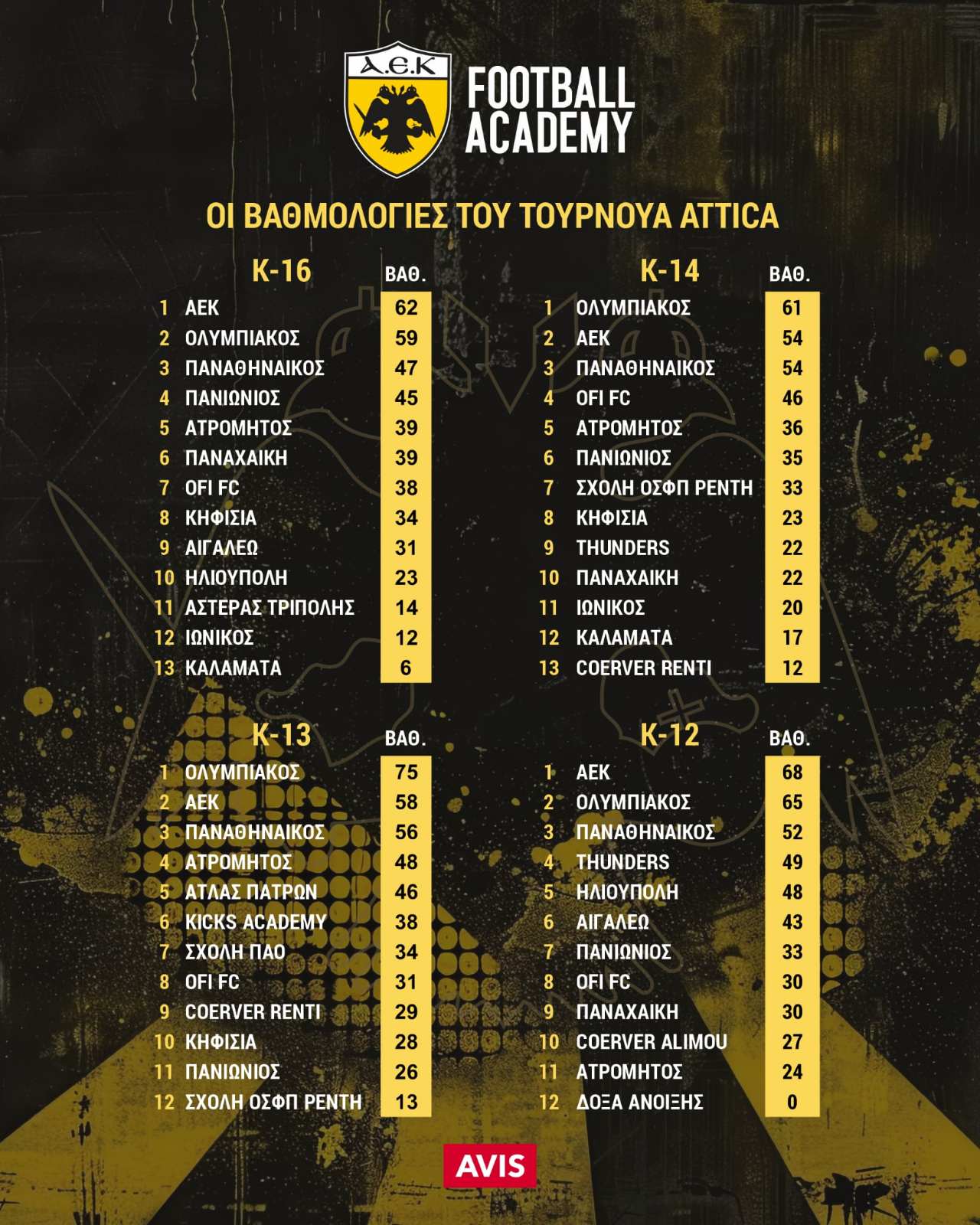 Το τουρνουά Attica, η πιο σημαντική διοργάνωση ακαδημιών για τις ηλικίες για τις οποίες δεν διεξάγονται αναπτυξιακά πρωταθλήματα Super League, οδεύει προς τις τελευταίες αγωνιστικές του και οι δύο από τις τέσσερις ομάδες της ΑΕΚ που συμμετέχουν σε αυτό, βρίσκονται στην κορυφή της βαθμολογίας των ηλικιακών κατηγοριών τους.
