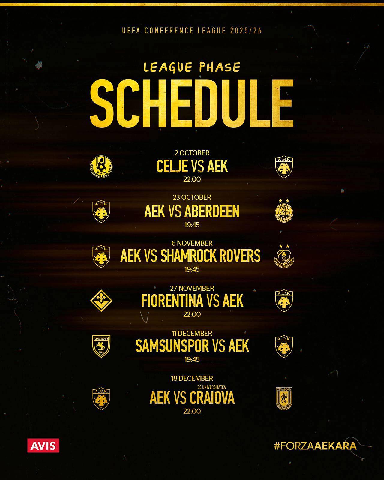Στο πλαίσιο της 4ης αγωνιστικής της League Phase του UEFA Conference League ο Δικέφαλος θα αντιμετωπίσει στην Ιταλία την Φιορεντίνα (Πέμπτη 27/11) στις 22:00, ακολουθεί η μάχη στην Τουρκία απέναντι στην Σαμσουνσπόρ (Πέμπτη 11/12) στις 19:45 ενώ η ΑΕΚ ολοκληρώνει την συγκεκριμένη φάση με τον αγώνα απέναντι στην Κραιόβα στη Νέα Φιλαδέλφεια (Πέμπτη 18/12) στις 22:00.