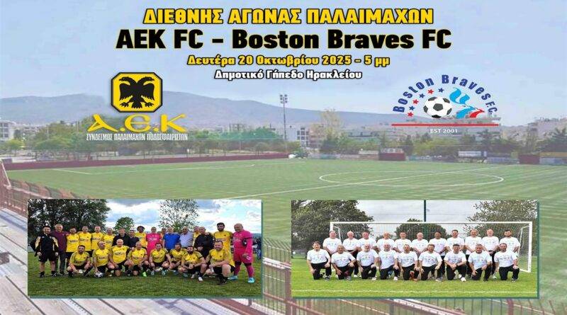 Το απόγευμα της Δευτέρας 20 Οκτωβρίου (5 μμ) στο Δημοτικό Γήπεδο Ηρακλείου Αττικής θα υποδεχθούν τους Boston Braves της Βοστόνης, μια ομάδα με έντονο ελληνικό στοιχείο που τα τελευταία χρόνια ταξιδεύει σε όλο τον κόσμο και παίζει αγώνες με ομάδες παλαιμάχων από τους μεγαλύτερους συλλόγους (Μπάγερν, Μπαρτσελόνα, Μίλαν, Μάντσεστερ Γιουνάιτεντ κ.α.).