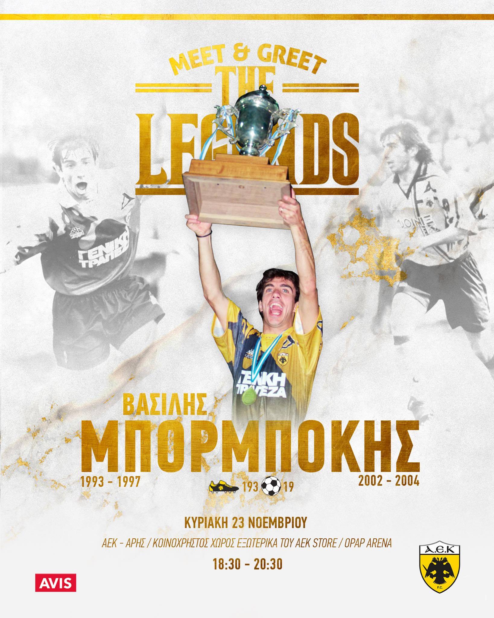Ο Βασίλης Μπορμπόκης θα βρίσκεται την Κυριακή 23 Νοεμβρίου στην OPAP Arena για να συναντηθεί με τους φίλους της ΑΕΚ, να φωτογραφηθεί μαζί τους και να υπογράψει αυτόγραφα.