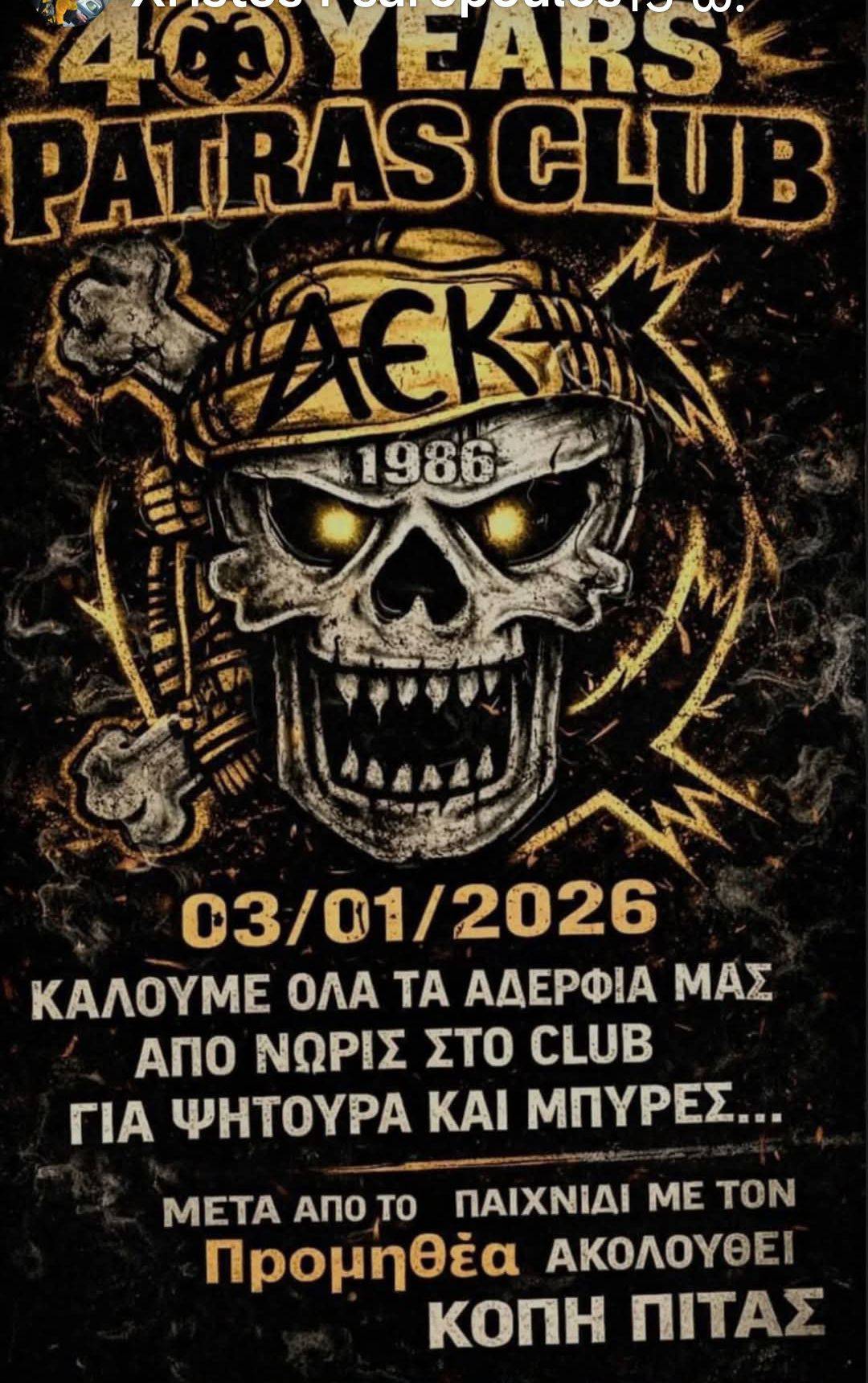 40 χρόνια Πάτρας κλαμπ. Από νωρίς το Σάββατο θα έχει ψητούρα και μπύρες ενώ μετά τον αγώνα με τον Προμηθέα θα ακολουθήσει κοπή πίτας.