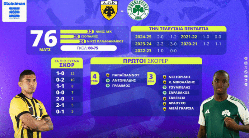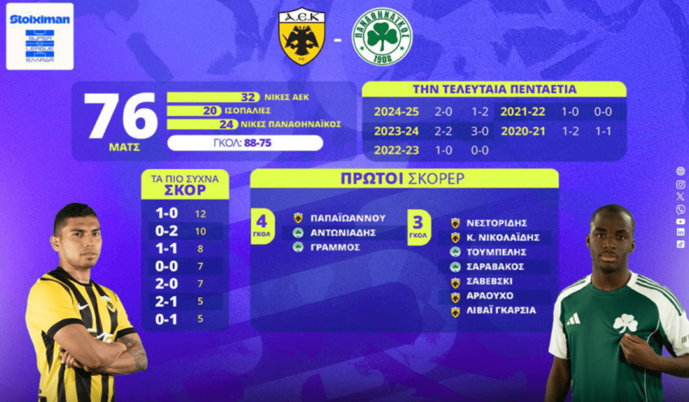 Σε 76 παιχνίδια η ΑΕΚ μετρά 32 νίκες, 20 ματς έχουν έρθει στο… Χ και 24 τα κέρδισε ο Παναθηναϊκός.